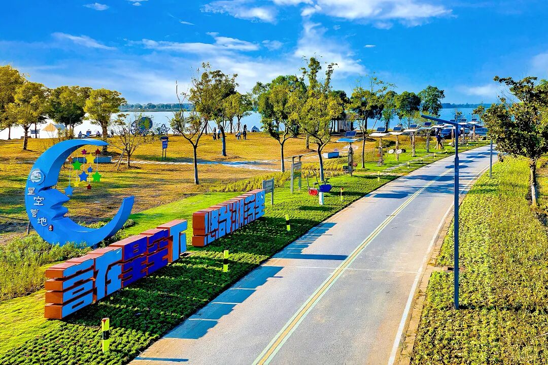 星空营地位于明镜荡环湖公路旁,营地边即是开阔的湖岸线,风景怡人,是露营的绝佳地。通过提升绿化景观,在原营地构筑物前增加灯光、增设LOGO等,增强营地主题氛围。