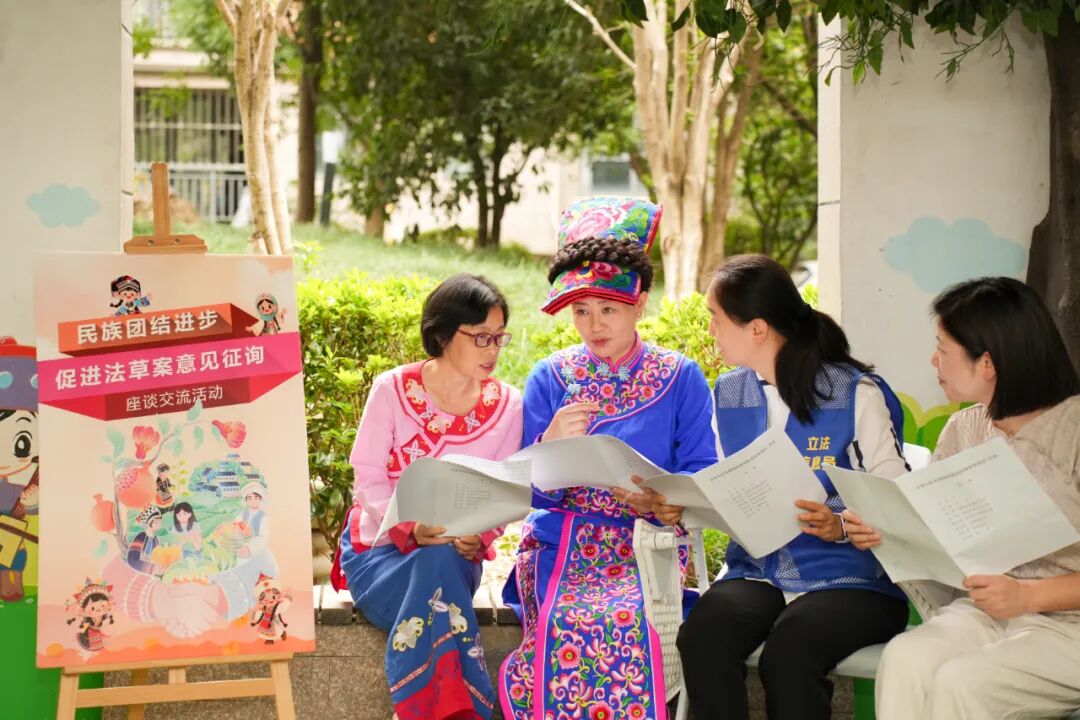 ▲来自羌族、朝鲜族等多个少数民族的居民齐聚陆家镇邹家角社区“民族之家”,围绕《中华人民共和国民族团结进步促进法(草案)》内容踊跃建言