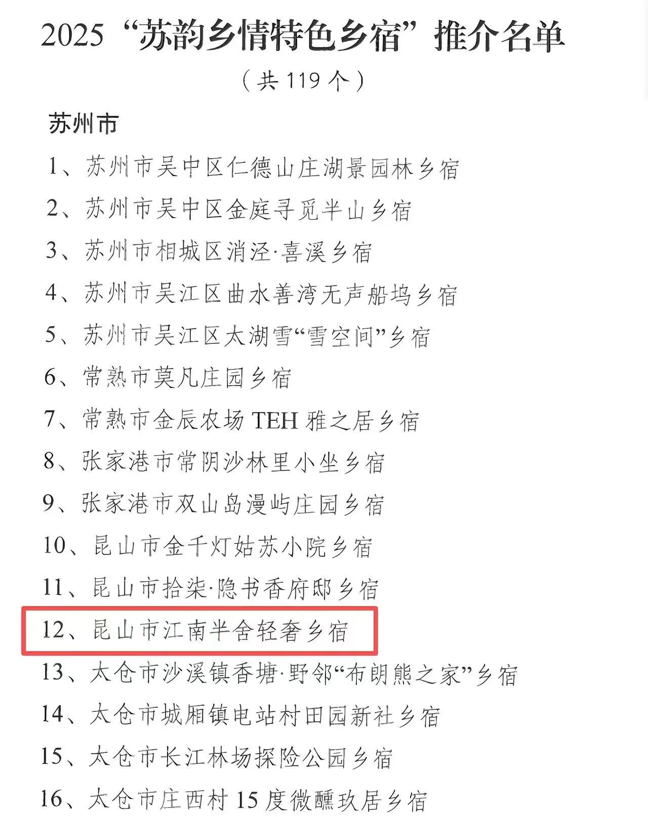 近日,省农业农村厅发布《关于推介“苏韵乡情 特色乡宿”的通知》,锦溪镇“江南半舍轻奢乡宿”成功入选,成为昆山市乡村旅游品质提升的又一亮眼成果,为水乡民宿赋能乡村振兴写下生动注脚。