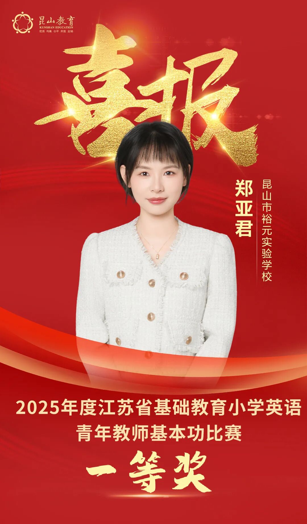 在近日举行的2025年度江苏省基础教育青年教师教学基本功比赛中,我市裕元实验学校教师郑亚君,在小学英语青年教师教学基本功比赛中荣获省一等奖。