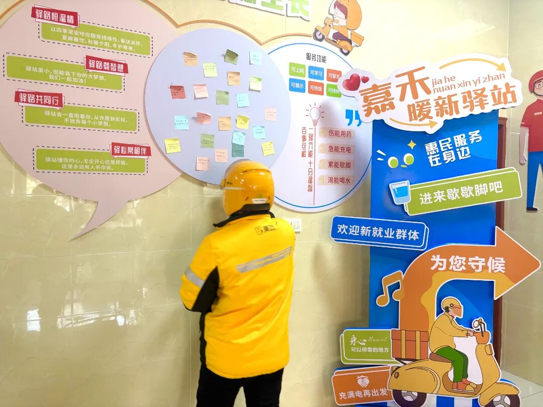 驿站一角的“暖心留言墙”上,彩色便签贴满墙面。“感谢社区温暖,用心送好每一单”“暖‘新’驿站是寒冬避风港”……一句句真挚留言,既是谢意也是承诺,搭建起社区与新就业群体的情感桥梁。