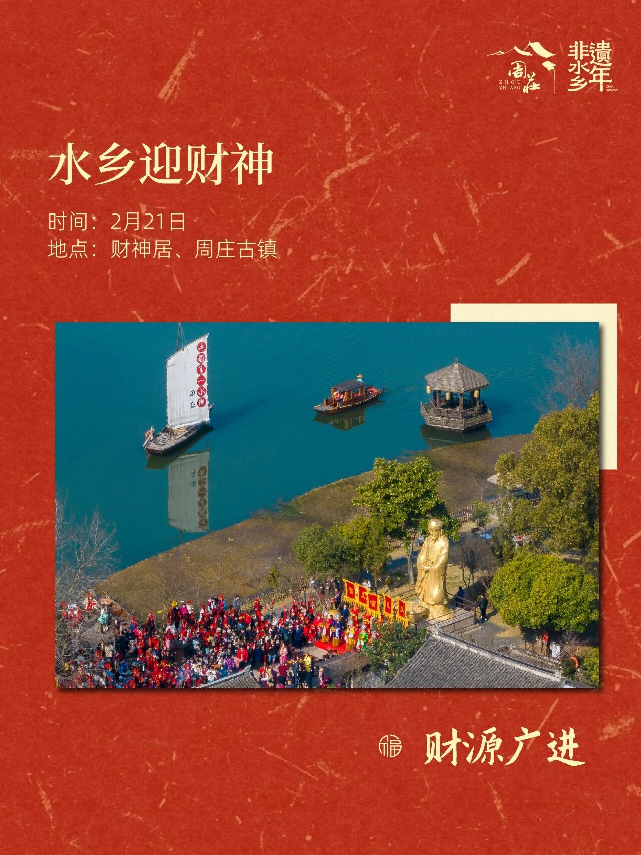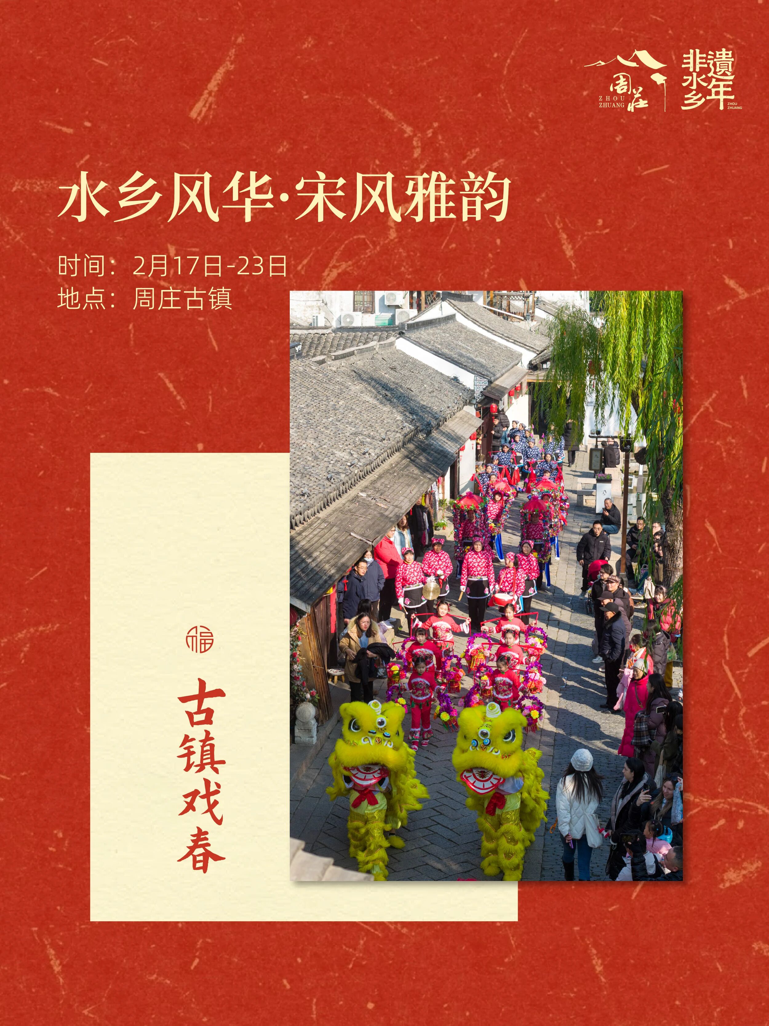 随着农历新年临近,周庄古镇精心策划“非遗水乡年”系列活动,围绕水乡年、非遗年、科技年主题,推出非遗展演、新春潮集、新春灯会等多元活动,诚邀海内外市民游客在江南烟火中,感受文化之美、共赴幸福之约。值得一提的是,2月15日至23日,属马的市民游客凭本人身份证可以免门票,同时派发“新春福袋·礼遇周庄”百万文旅心意券。