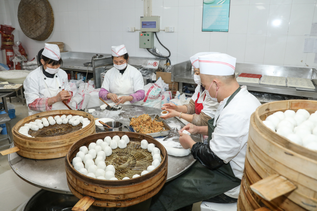 2月4日清晨6时,天刚蒙蒙亮,常州糕团店的后厨已是一片忙碌景象。揉面、包馅、蒸制、打包,几十位点心师傅分工协作,动作娴熟利落。