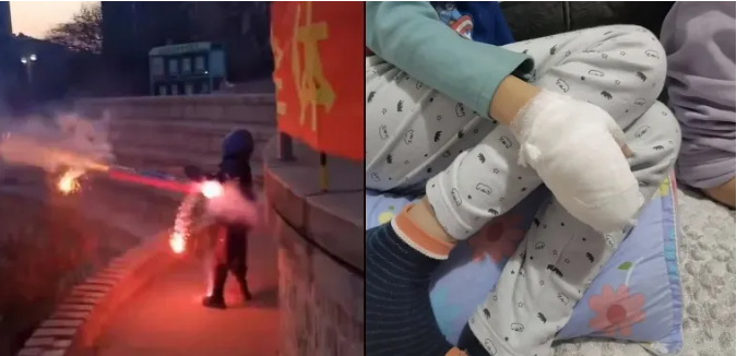 2024年2月10日大年初一,辽宁大连,一男孩手持加特林烟花进行燃放,不慎将手烧伤。