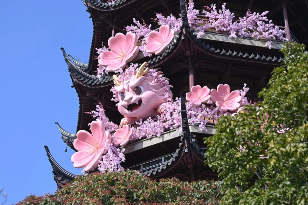 核心文旅地标发力,人文体验与消费场景深度交融。天宁胜境与红梅公园承载着常州人数代人的新春记忆,赏梅佳时,第十九届梅花游园生活季如期启幕,千株红梅缀枝吐艳,文笔塔下12米花瀑倾泻而下,常州IP“常宝”憨态伫立,兼具江南清雅与新春灵动。园内“城里尘外・梅满集”市集暖意融融,小吃飘香、文创非遗错落陈列,带动消费持续攀升,数据显示,除夕至初三,天宁胜境累计接待游客近30万人次,大年初一单日客流破11万人次,祈福赏梅、逛集淘宝,成为常州人刻在骨子里的新春仪式。舜山小镇则融自然之美与人文之趣,游客手持“集福地图”打卡兑礼、互动嬉戏,全天候演艺传递温情,夜幕下,鱼灯巡游、非遗铁花、烟花秀与无人机表演交相辉映,让游人沉醉其间,带动景区消费攀升。