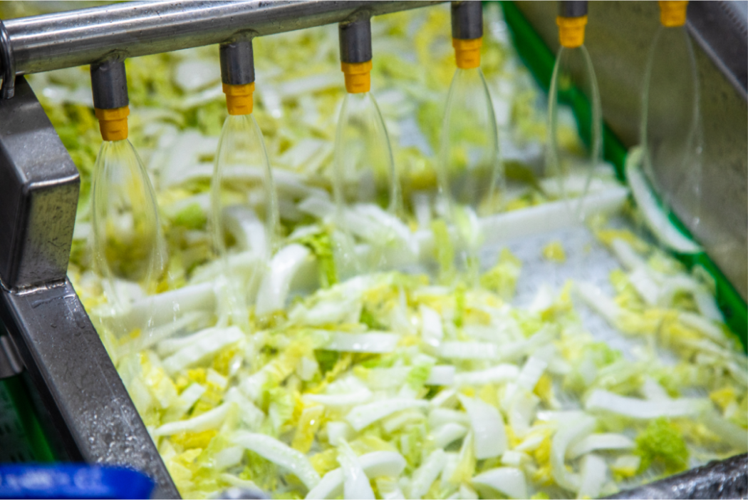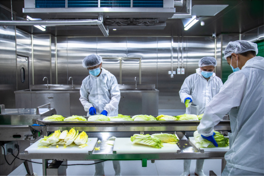 在合家欢蔬菜种植基地,新鲜采摘的蔬菜,被第一时间送进数千平方米的加工中心,无尘生产车间里,叶菜线生产流水线根茎线生产流水线等高效运转,将新鲜采摘的食材快速加工完成。