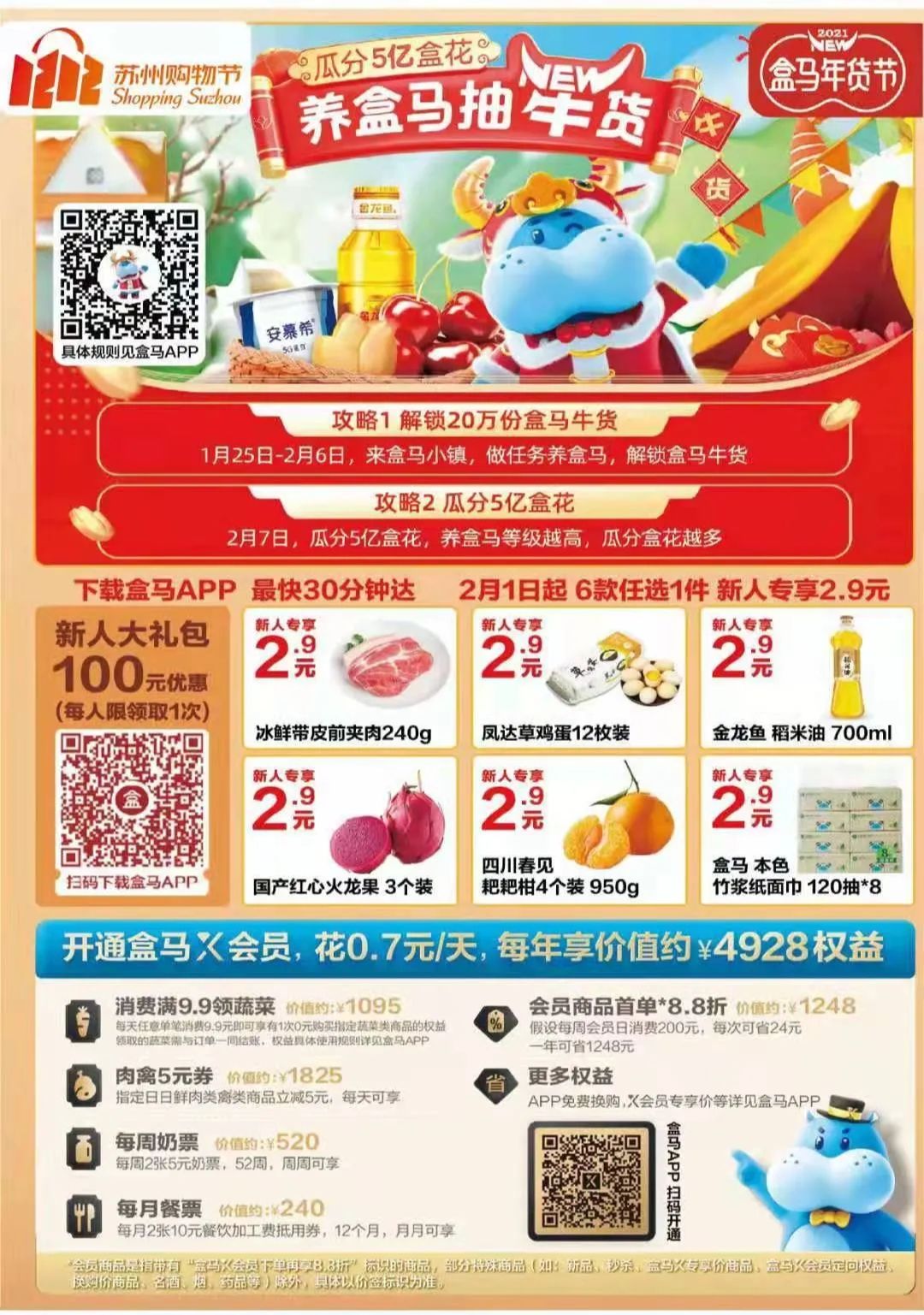 “新年上盒马,买点牛货”,盒马苏州各门店和app同步推出“牛货到家”、“牛货见面礼”、“牛货不打烊”、“牛货开门红”等主题促销,发放年货津贴,推出红包补贴、积分兑换、超值券包等活动。