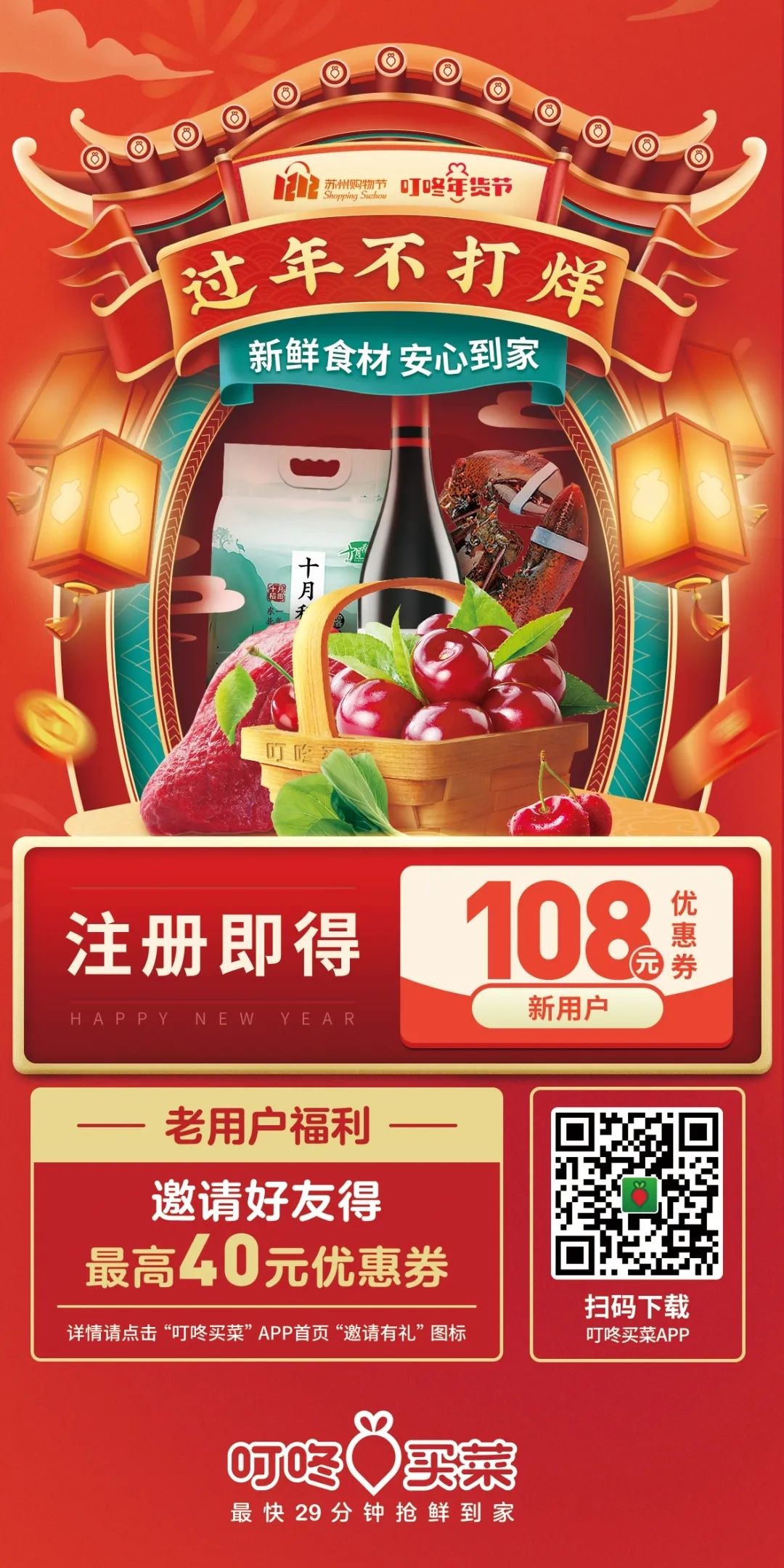叮咚买菜将推出“价格直降”、买一送一、限时秒杀等活动,春节5折不打烊,充足好货送到家。