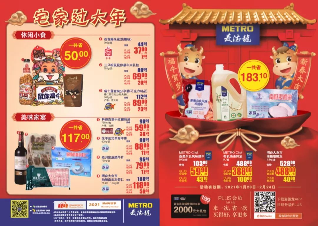 麦德龙年货特辑,线上线下同步开展部分商品买一送一、第二件半价、礼盒类商品折扣等活动。