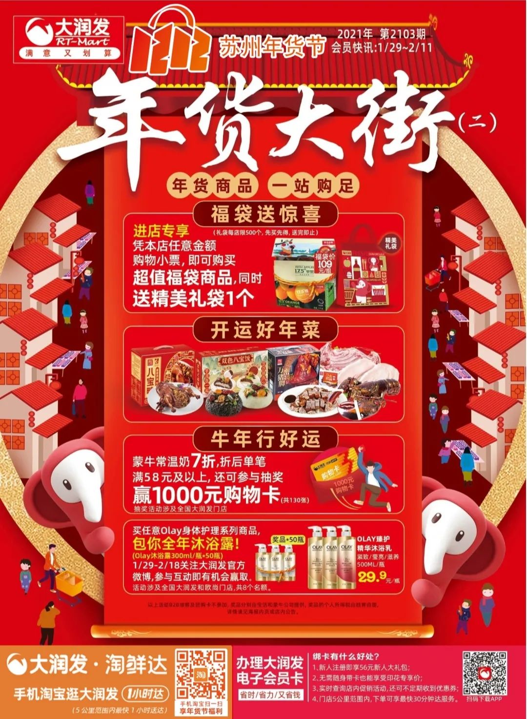 大润发、欧尚年货大街,全市28家线下门店与线上平台同步推出“牛气好年货”“牛气大换购”“洗迎牛气年”“食足好年味”等各类满减低价活动。