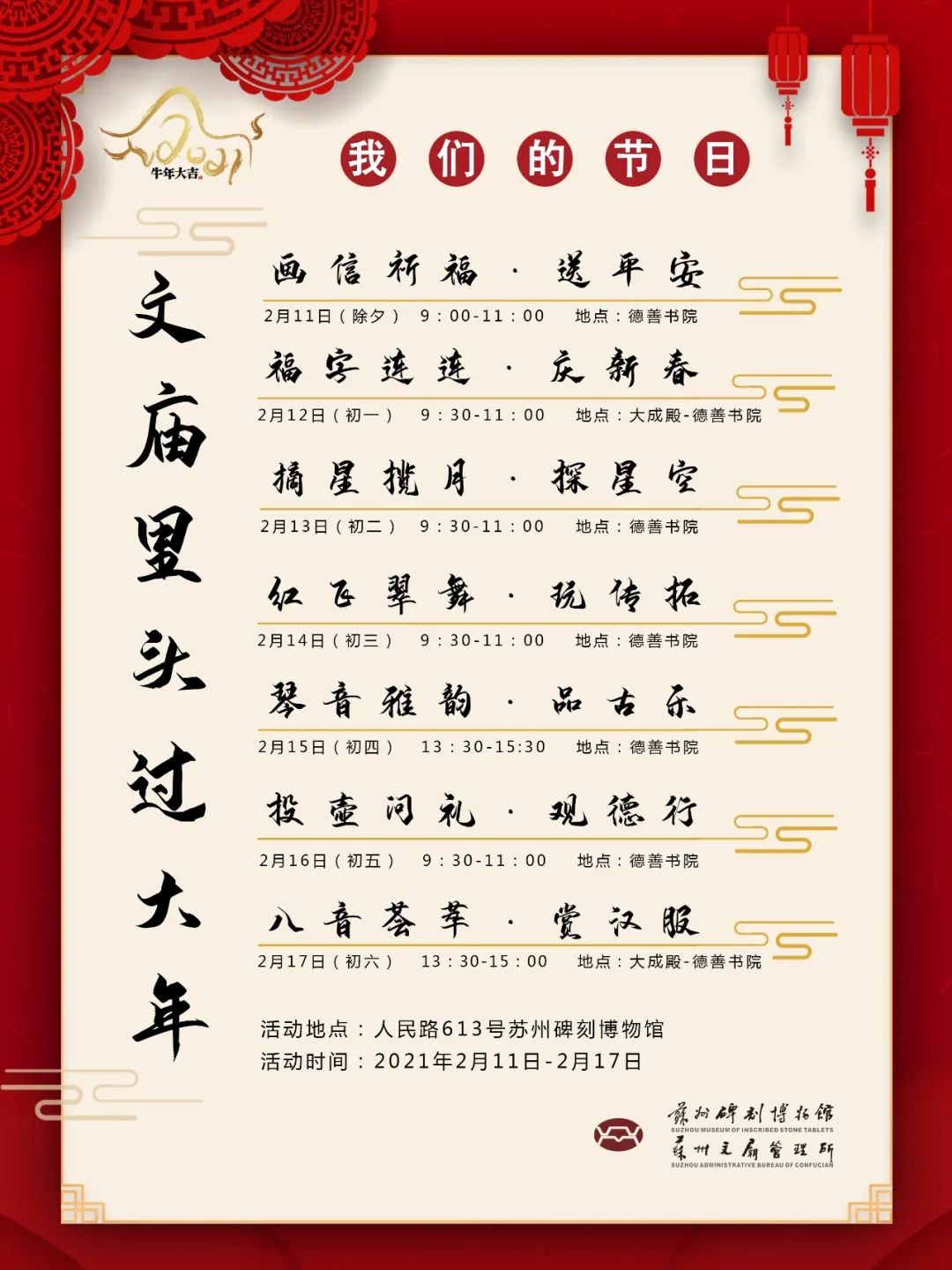 全市各级美术馆、博物馆将推出系列苏式年味生活体验活动,如苏州博物馆“藏在古诗词里的新年祝福——春节主题诗词线上诵读打卡活动”,苏州碑刻博物馆“文庙里头过大年”体验活动等。