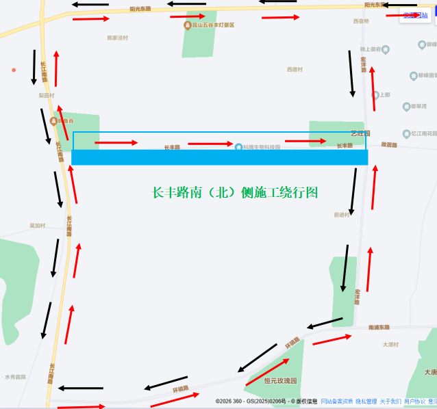 昆山市城市污水收集处理设施改造工程(千灯镇三标),计划于2026年3月11日至2026年6月30日对长丰路实行南半幅封闭式施工,于2026年6月30日至2026年12月31日对长丰路实行北半幅封闭式施工,届时实行车辆半幅单向通行。请有条件的车辆及行人提前规划好线路避开施工路段,经长丰路至长江路绕行。(后附施工计划及绕行图)