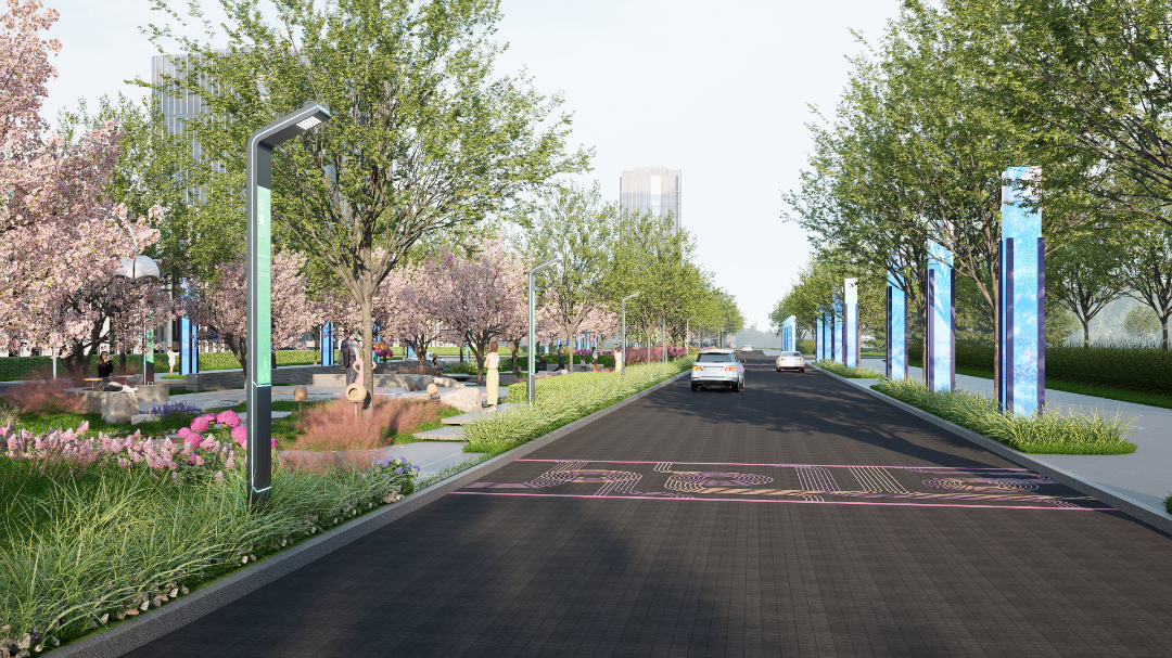 彩桥路是花桥中央商务区的中轴线,同时也是衔接中央公园的形象道路,在更新时注重道路景观与公园风格的视觉延续性和整体性。本次更新计划分两期进行,一期内容为对彩桥路和绿地大道交叉口进行局部绿化更新,新增特色地景及入口标识,对中分带的水景进行清洗修缮,同时在两侧绿化带种植挺拔乔木,新增艺术灯具等,总面积约5300平方米。二期计划对中分带进行昆小薇改造,通过植入互动性景观设施,打造兼具生态与社交价值的高品质公共空间。