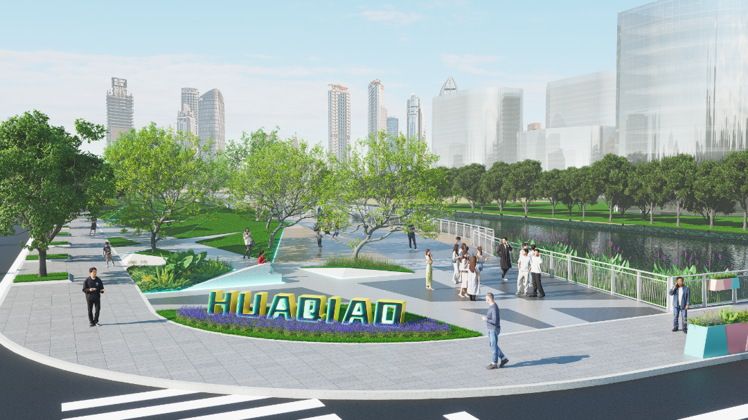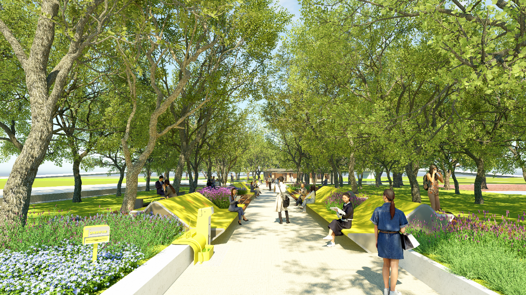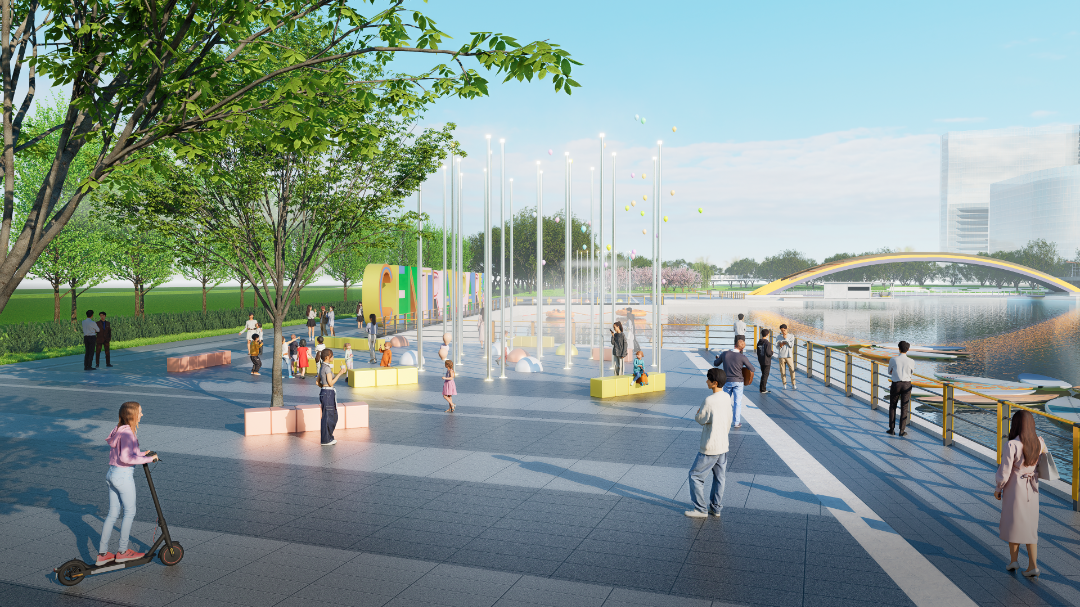 项目以打造沉浸式滨水社交场地为出发点,兼顾活力、实用与生态,总面积约2万平方米。设计时场地兼顾对岸视线联动,两侧采用对称布局,衔接周边、完善空间连贯性,错落布置私密与开敞空间,融合周边建筑业态,满足市民多元需求。绿化更新则在保留形态优美的现状大乔木基础上,对林下空间进行梳理,同时进行岸线修复,打造高品质的滨水公共空间。同时对广场北侧闲置地块进行一轮绿化更新,局部营造花海景观并植入一系列城市家具,为市民打造共享活力绿洲。