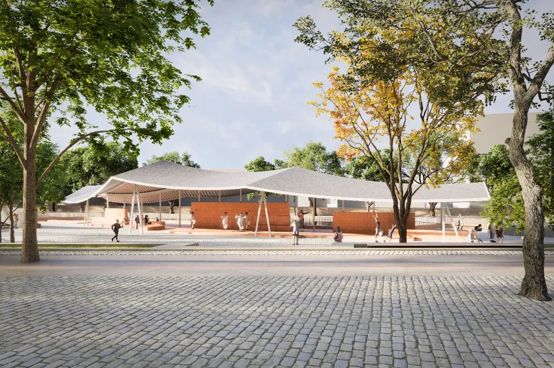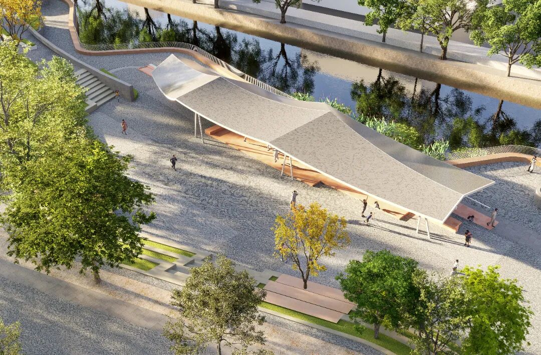 项目位于昆山花桥花溪路北侧、蒋浦路东侧,占地约1500平方米,场地内原有景观廊架年久破损,影响环境面貌且市民使用意愿较低,公共空间功能未充分发挥。本次更新内容深度结合场地现状与周边水系,围绕“水边戏台”核心概念开展“昆小薇”更新,延续场地记忆的同时梳理空间结构、重塑功能,打造以大屋顶为特征的开放式滨水标志物,融合观景、休闲、文化展示等功能,既成为视觉焦点,又为周边市民提供舒适有归属感的休憩场所。
