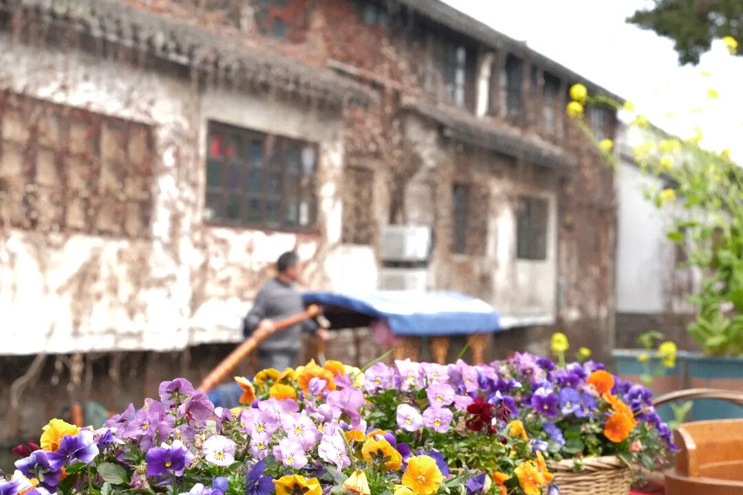 最动人的是桥下的风景——周边的居民在河岸的台阶上、桥堍的空地里,摆满了大大小小的盆栽。此时春意正浓,那些盆栽都已盛开,把灰白的石桥装点得生机盎然。一位正在浇花的阿婆笑着说:“养了几十年花,春天是它们最美的样子。”