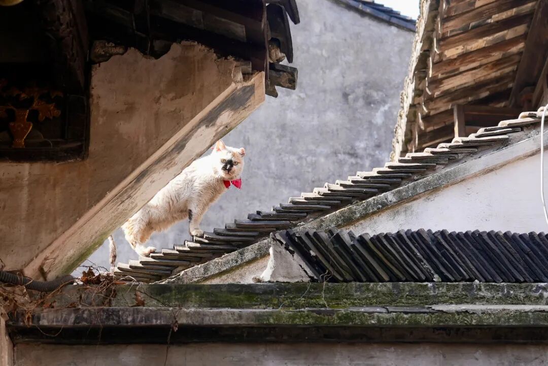 猫咪懒洋洋地卧在青石板上,沐浴着春日暖阳,偶尔伸出粉嫩的肉垫拨弄一下飘落的柳絮。
