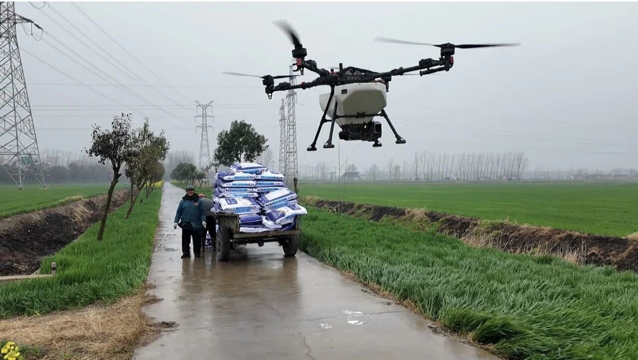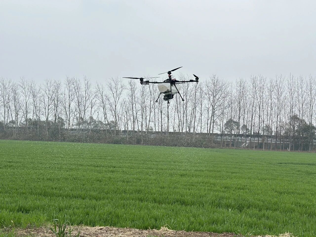 田埂上,一架黑色的植保无人机已准备就绪,机身料箱里装满了颗粒状的“拔节孕穗肥”。操作人员在手机屏幕上设定好飞行路线、撒肥幅宽和流量参数,然后轻轻一点“起飞”。伴随着轻微的嗡鸣声,无人机稳稳升空,在细雨中朝着绿油油的麦田深处飞去。