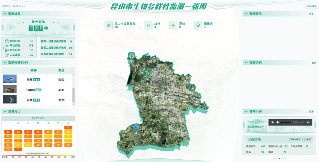 昆山以科技赋能生态监测,在全市4个观测点位部署20台高清摄像头、红外遥感、声纹采集终端等多种先进观测设备,结合AI智能物种识别技术,实现对鸟类、哺乳动物等物种的全天候实时监测、数据自动采集与智能分析,真正实现“看图识兽、听声辨鸟”,大幅提升了监测效率和准确性。通过整合四大观测点监测数据,昆山建成生物多样性大数据管理平台,形成可视化“一张图”,能够精准定位不同生态系统下鸟类的栖息偏好与活动特征,为生物多样性保护提供了科学详实的数据支撑,推动昆山生物多样性保护工作从“定性描述”向“定量分析”转变。