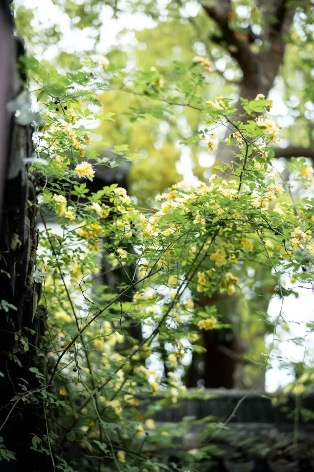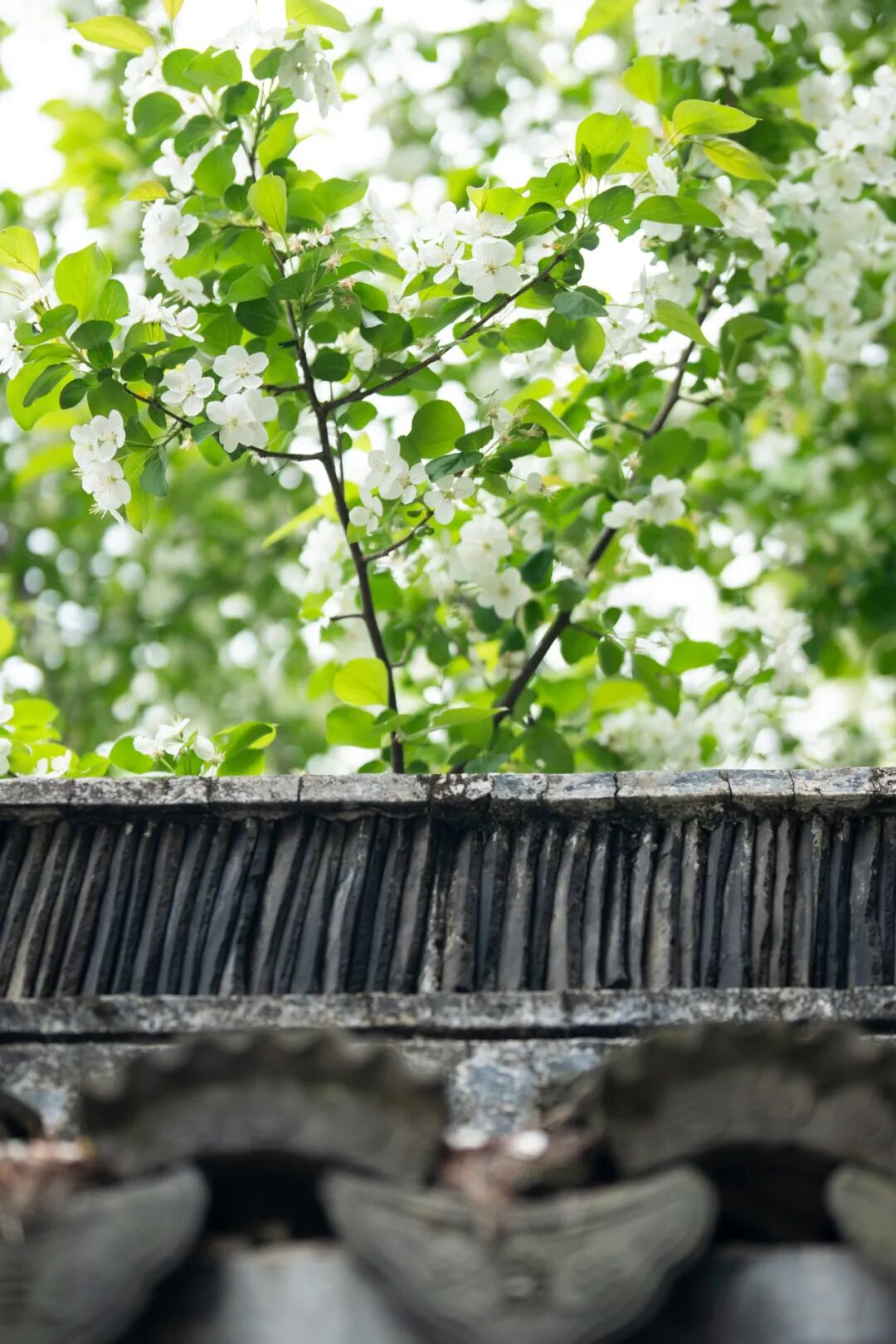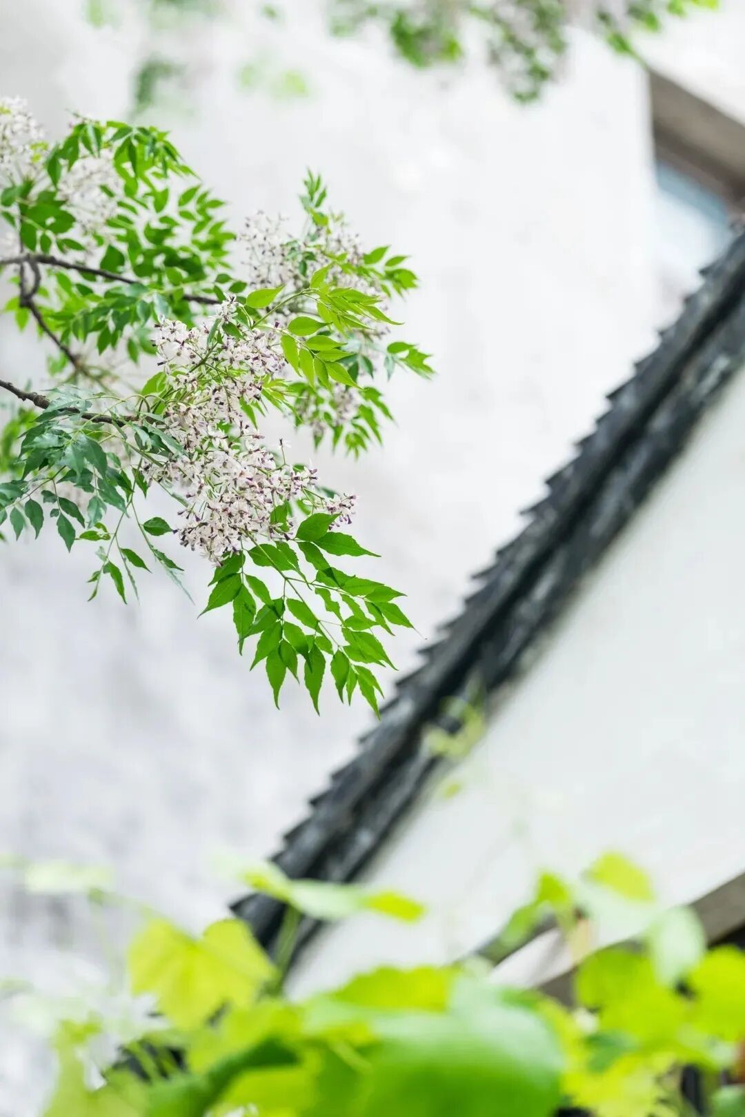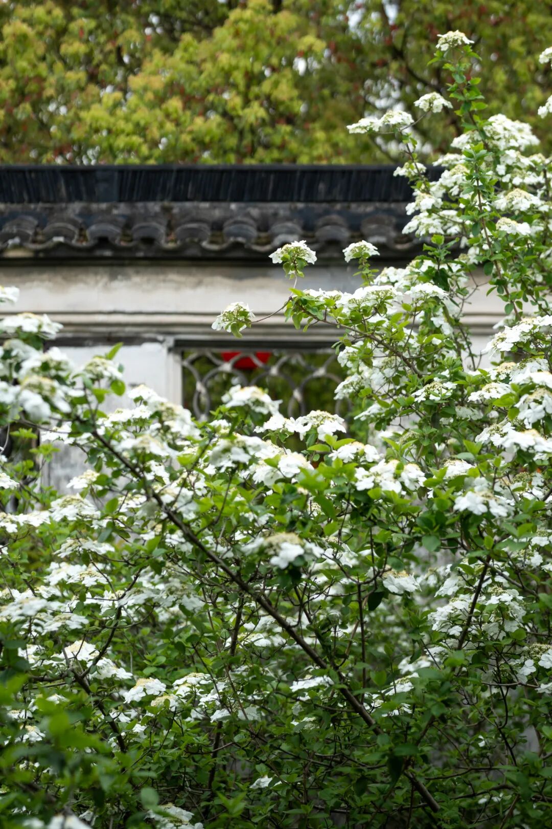 周庄博物馆的院墙边,木香花静静地垂落。细碎的小白花密密匝匝,像一串串星星串成的瀑布,从墙头倾泻到半腰。