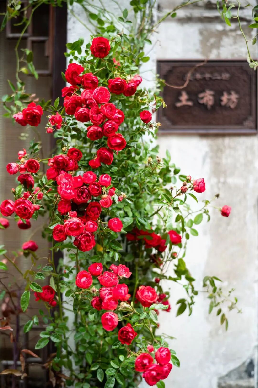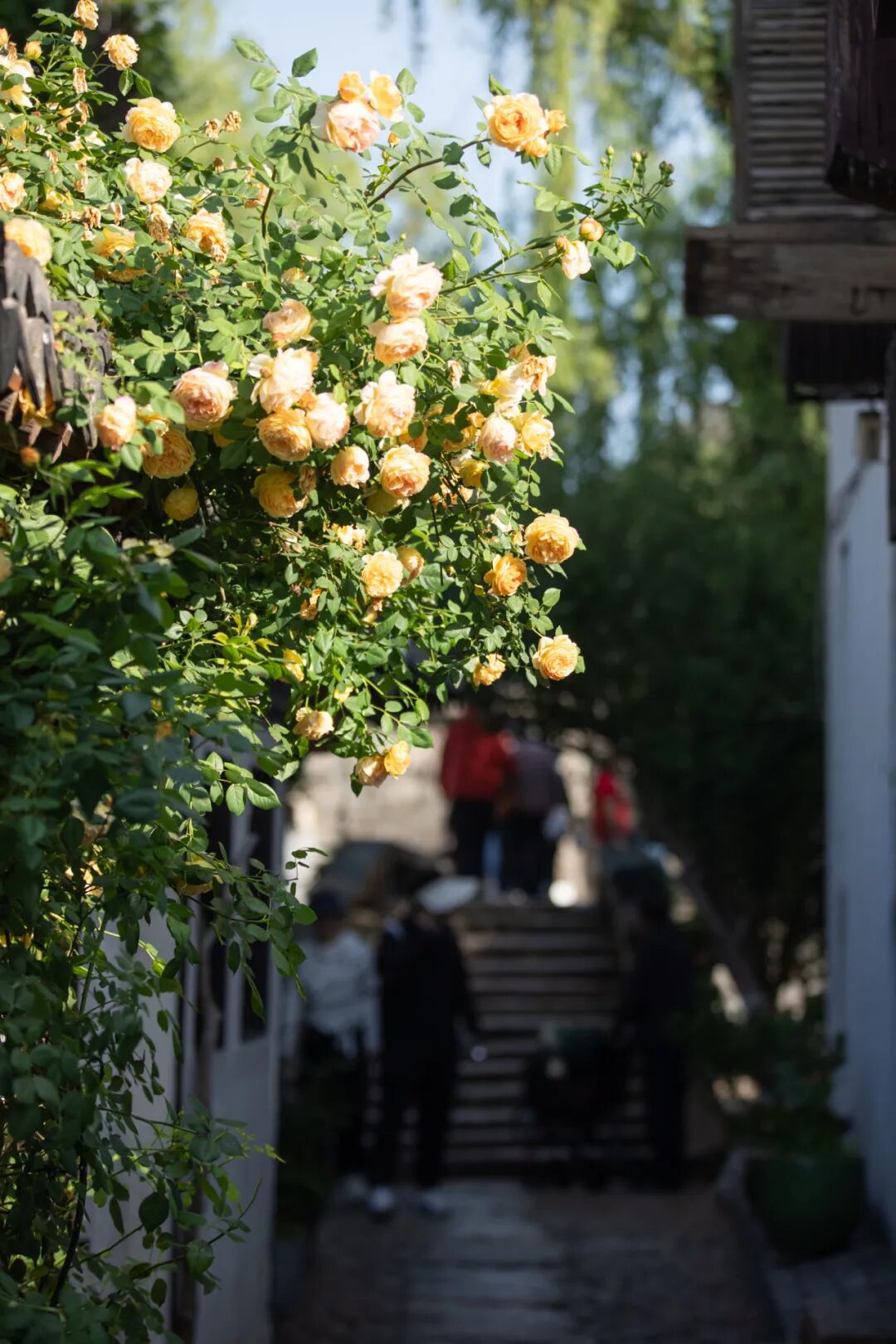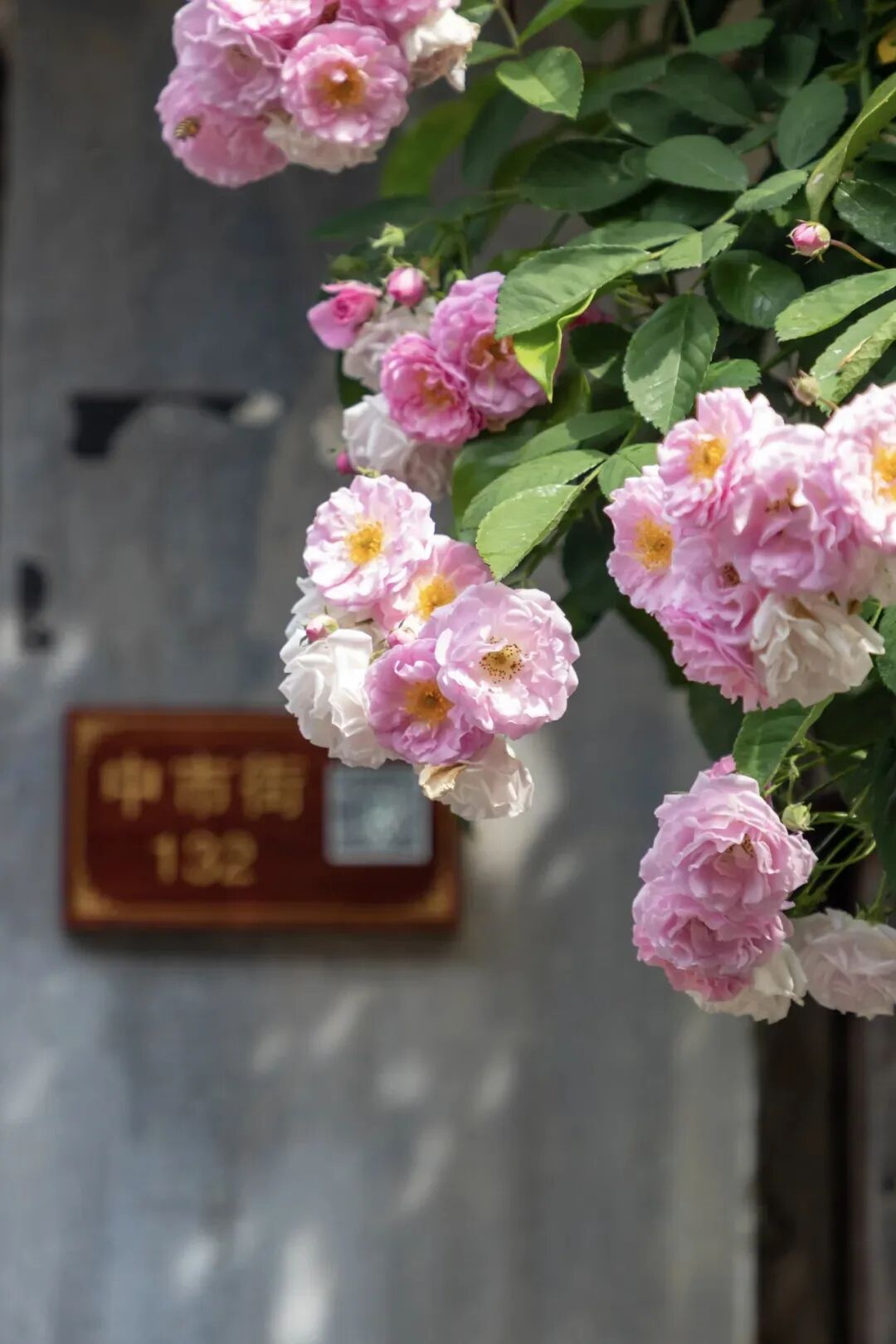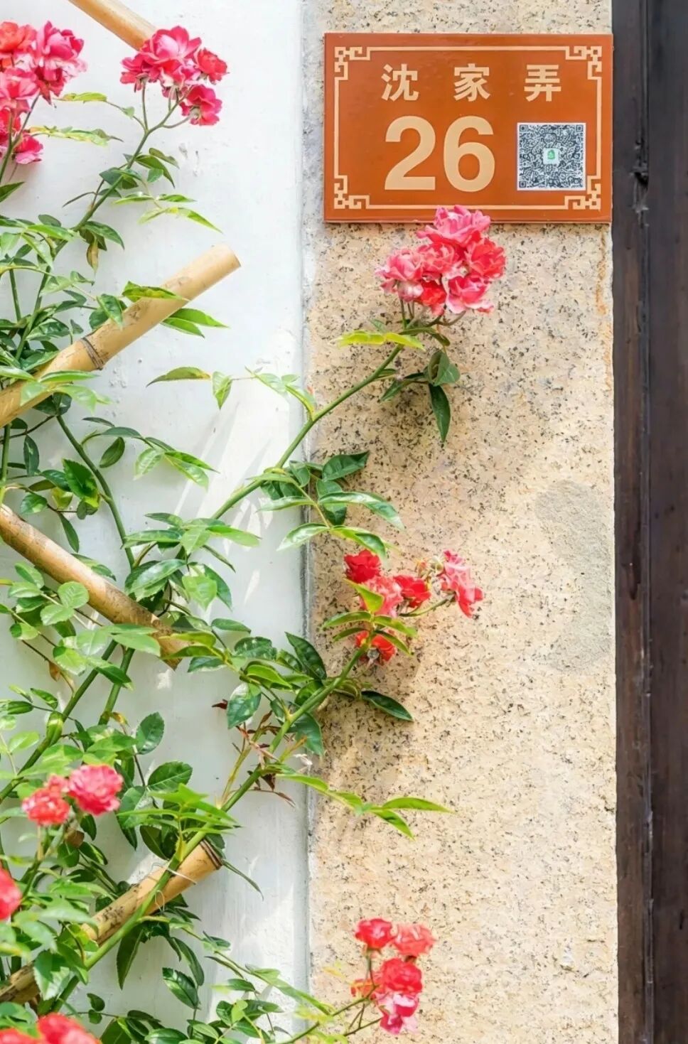 沈家弄的月季正当时,红的、黄的、粉的,一朵一朵开得大方又饱满。老墙灰瓦衬着这些明艳的花,像是旧画上新添的几笔亮色。