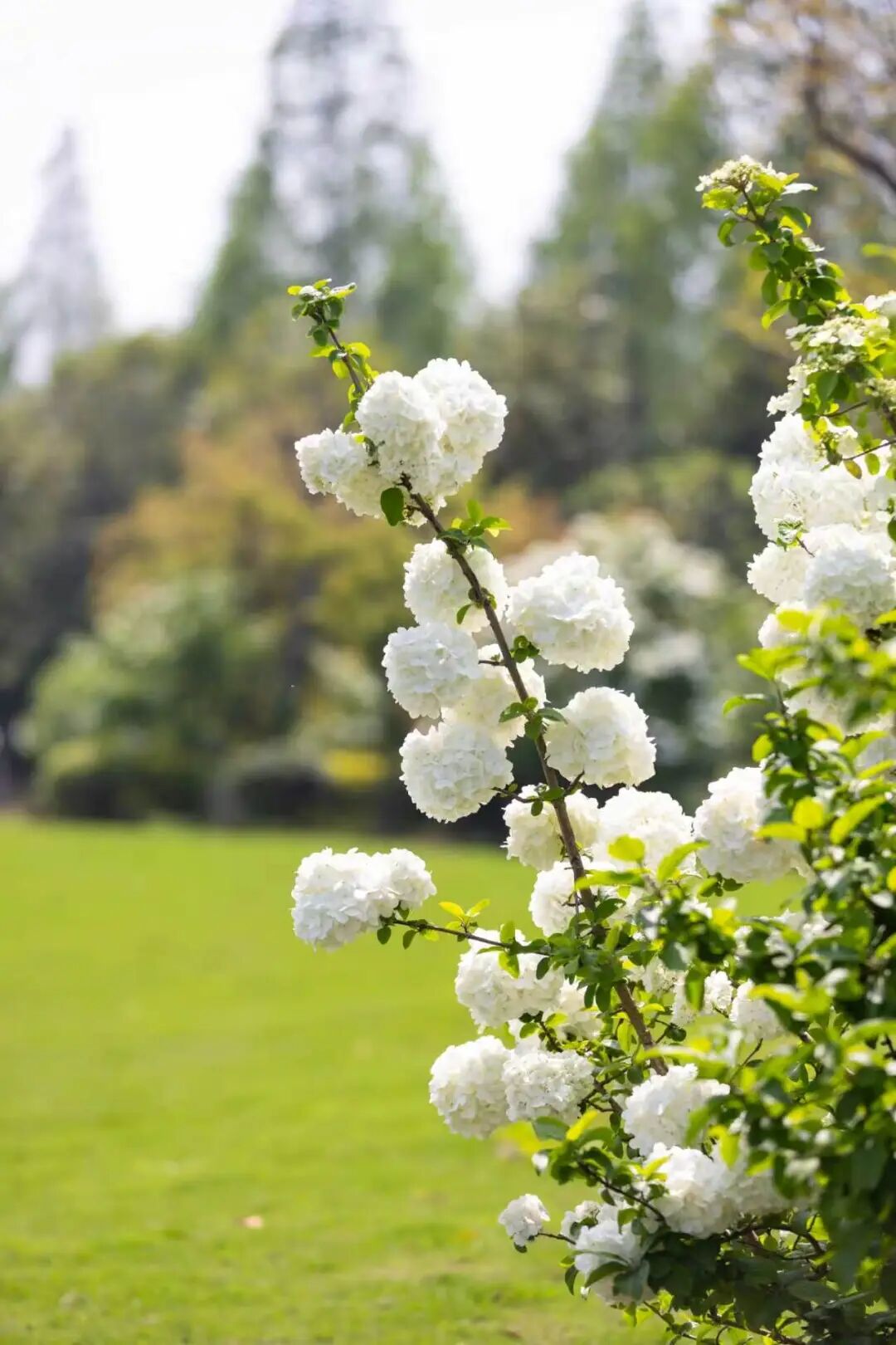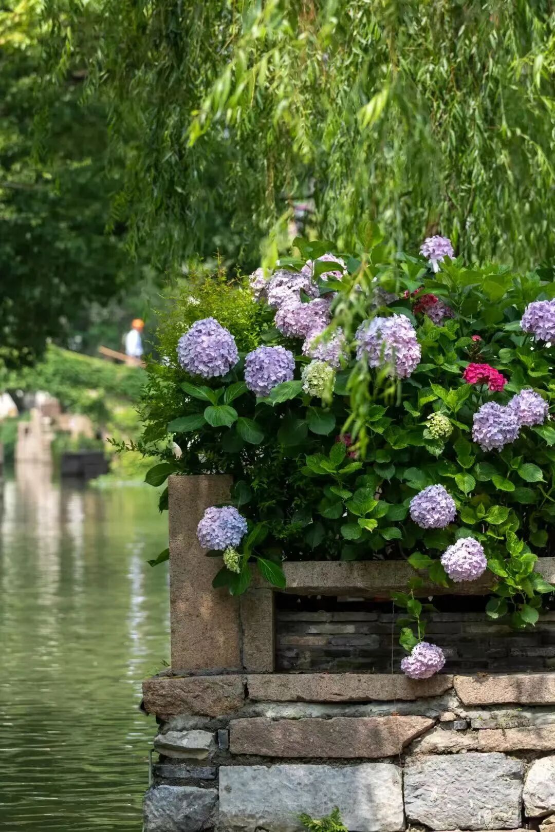 绣球藏在墙根下的拐角,白如初雪,粉如晚霞,圆滚滚的,憨态可掬。