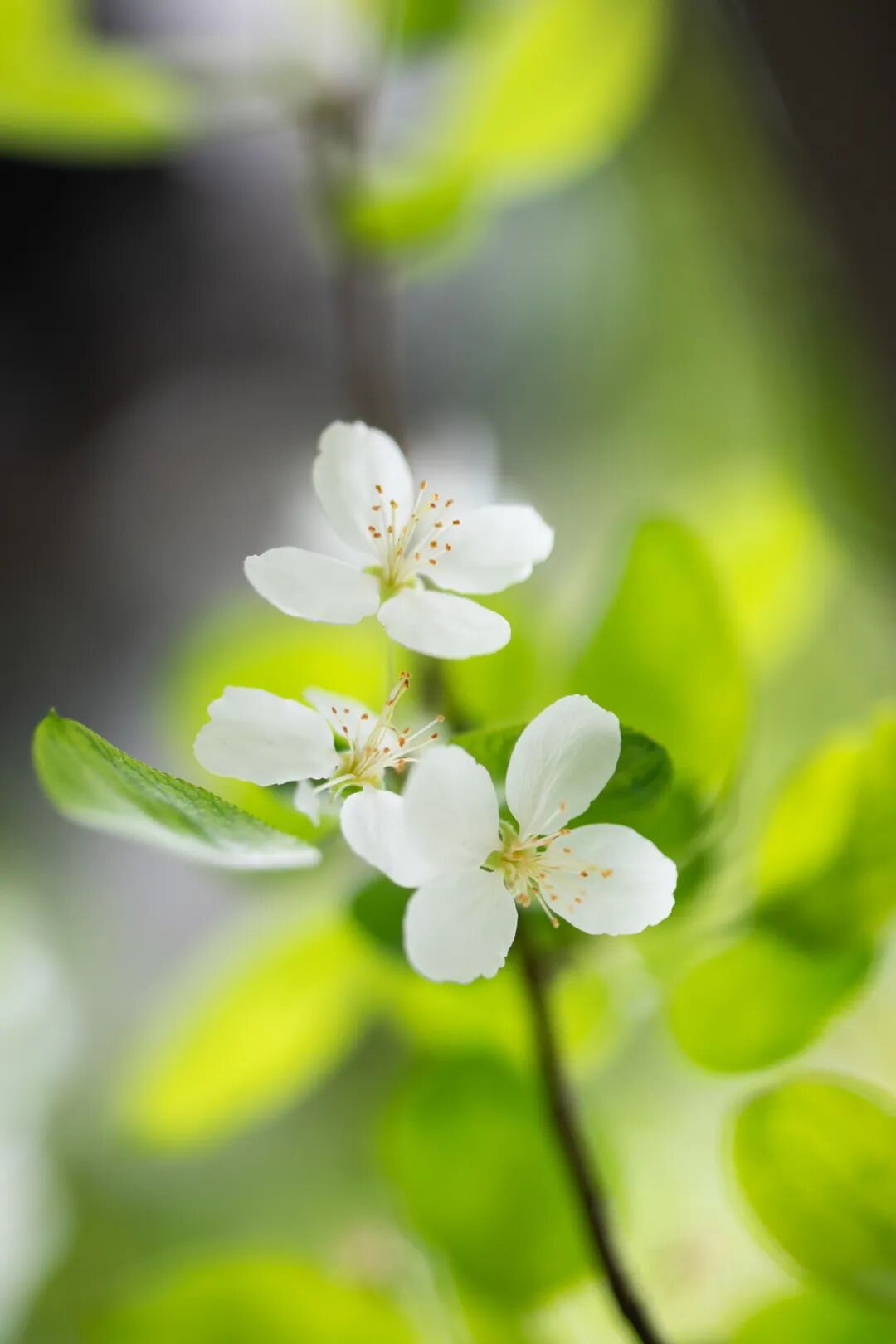 不经意路过墙边,发现西府海棠盛开,雪白的花瓣薄得透光。