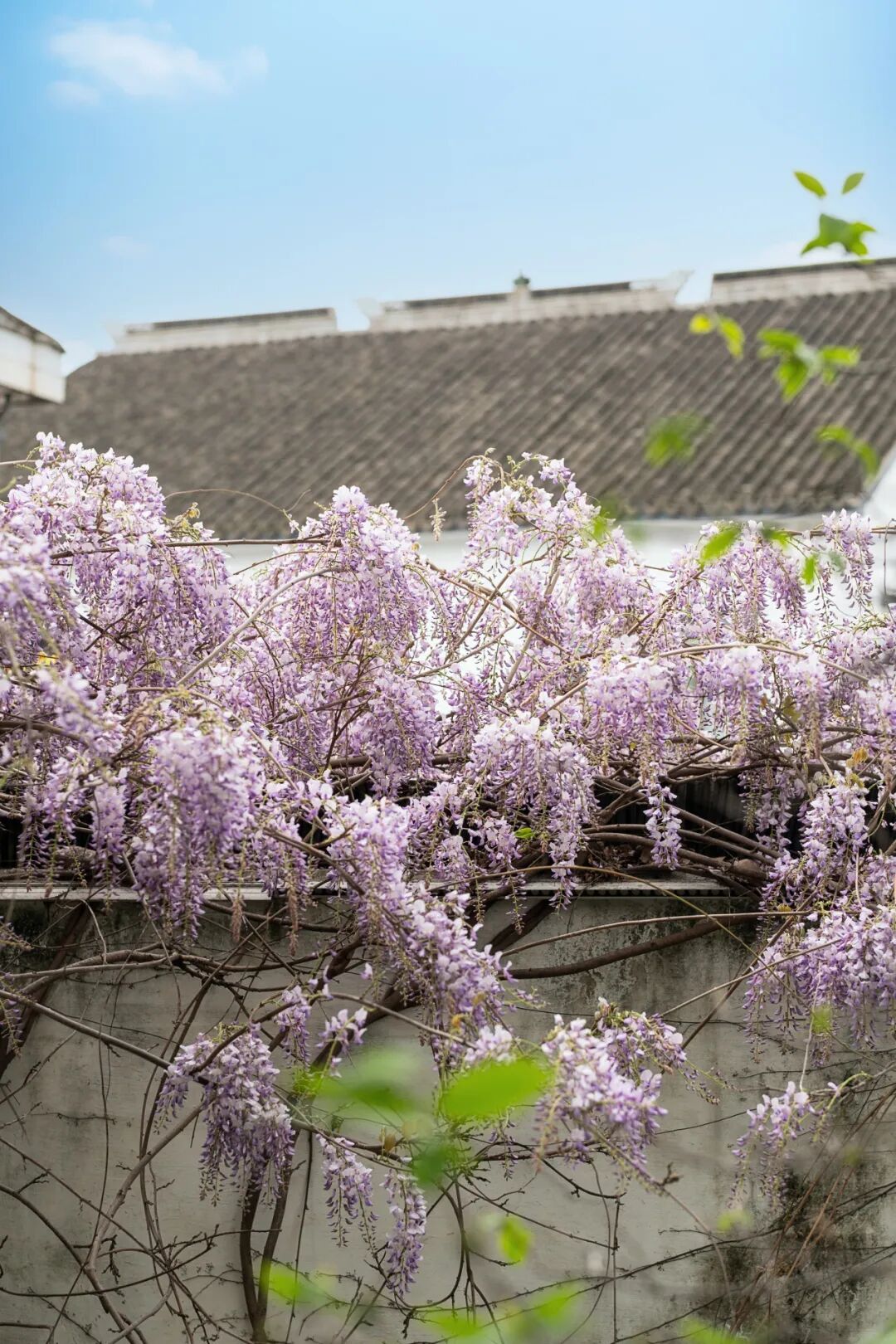 周庄香村·祁庄的老架子上,紫藤垂落,一串串如紫色铃铎,又如凝固的瀑。