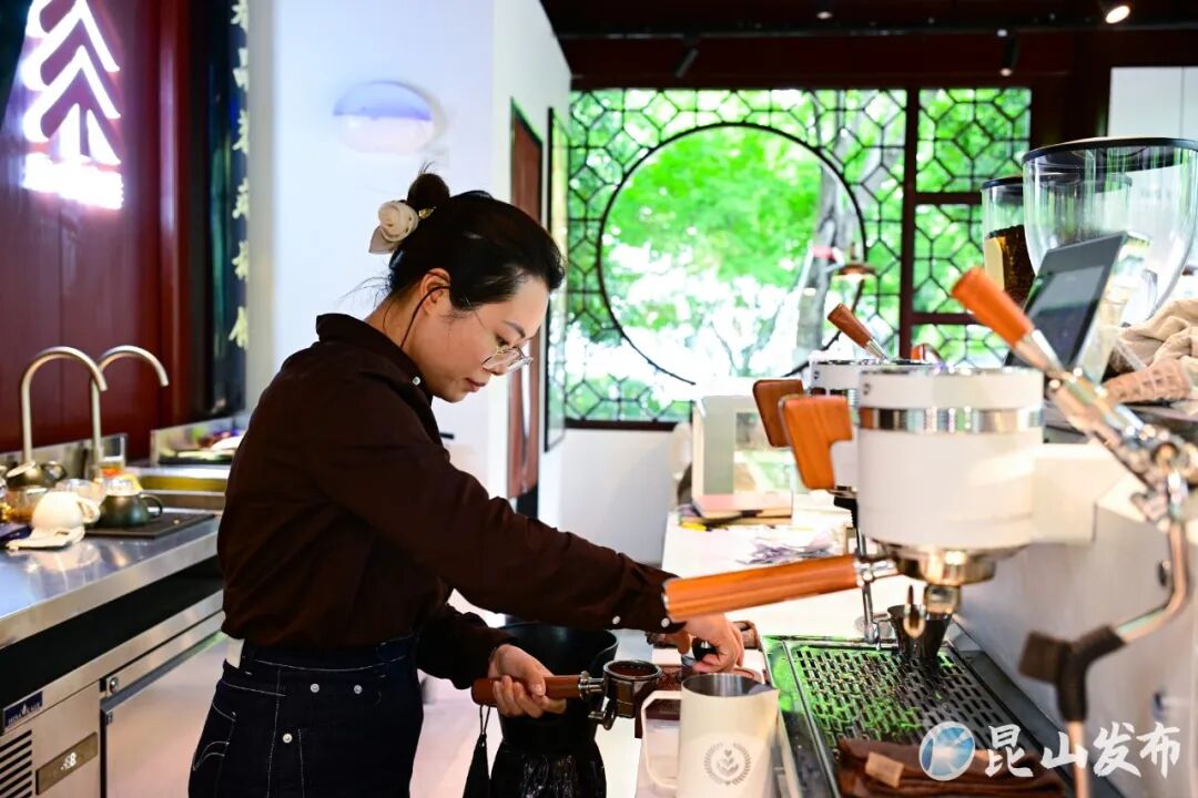 在这里,喝的不是咖啡,是“偷得浮生半日闲”的惬意。阳光透过枝叶洒下,伴着潺潺流水,轻抿一口印着梅花图案的精美咖啡,咖啡的醇厚与园林的清幽交融,仿佛能品味到岁月的沉淀与历史的幽香。黄敬用拉花,让每一位客人都触碰到昆山的文化温度。