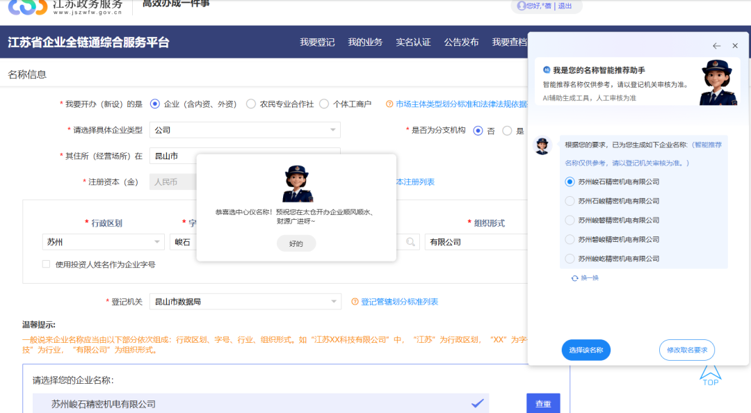 此次上线的“企业名称智能推荐”系统,其核心在于将过去的“被动查询”升级为“主动推荐”。该系统依托先进的智能算法与多维度的校验机制,操作路径清晰简洁。申请人只需完成三步设定:选定行政区划(如“昆山”)、输入行业描述(如“科技”“商贸”)以及确认组织形式(如“有限公司”),系统便会实时进行后台运算,并即时生成5个既严格遵循国家规范又精准贴合行业特色的企业名称,供申请人择优选用。