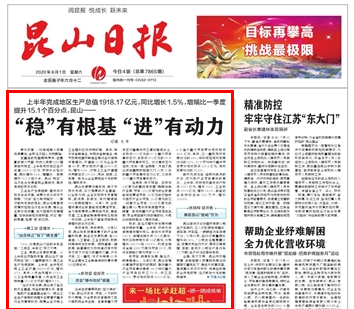 7月31日,苏州发布“2020年上半年苏州市高质量发展龙虎榜”,在六张榜单、共38项指标中,昆山上榜25项,包揽8项第一。获悉后,市融媒体中心(传媒集团)第一时间策划制作“昆山,转正!”微视频,展示了2020年上半年昆山经济由负转正、GDP同比增长1.5%,经济社会发展呈现企稳向好、稳中有进的良好态势。