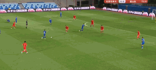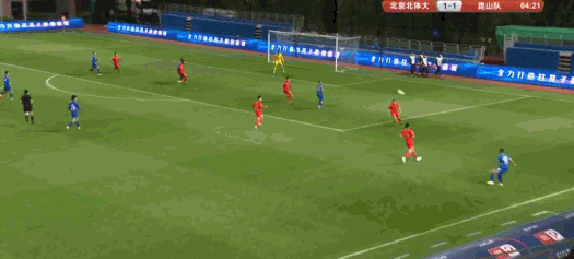 第73分钟,昆山队反超比分,张煜东直塞,冯伯元劲射得手,昆山队2-1北京北体大!