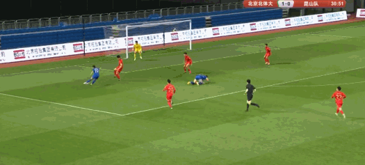 第35分钟,昆山队扳平比分,张成林胸部停球后世界波破门,昆山队1-1北京北体大。
