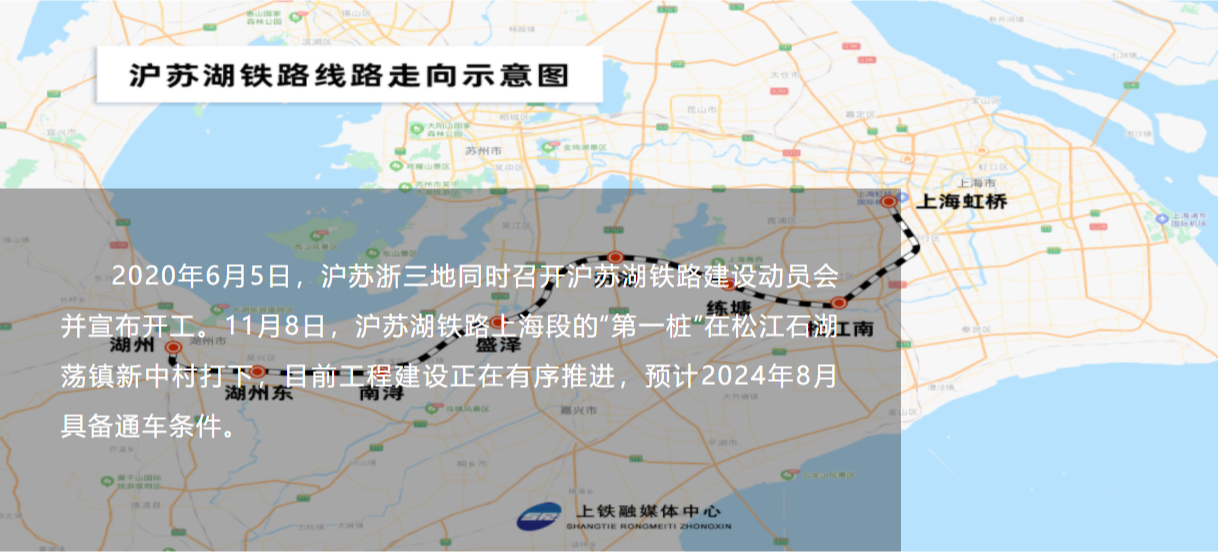 沪苏湖铁路是上海辐射江苏、安徽及中西部广大地区的重要客运通道,是商合(杭)沪客运专线的重要组成部分;是长三角城际轨道交通网的骨干线路;是环太湖轨道交通圈的重要组成部分,具有江南水乡特色的旅游休闲城际线;是一条集路网功能与城际功能并重的客运专线。线路东起上海市,从上海虹桥站综合场出发,沿既有沪杭高铁经春申、松江后折向西,同时设联络线在春申站北端接沪春线引入上海南站,上海南站普速设施搬迁至松江南站;途经江苏省苏州市吴江区,中部与规划建设的通苏嘉甬铁路衔接;西至浙江省湖州市,接既有商合杭高铁和宁杭高铁,并预留往杭州方向设置联络线条件,线路全长163.7公里,设计时速350公里。沪苏湖铁路全线设上海虹桥、松江南、练塘、汾湖、盛泽、南浔、湖州东(纳入湖杭铁路工程)、湖州8个车站,其中上海虹桥站和湖州站为既有车站,其他为新建中间站。