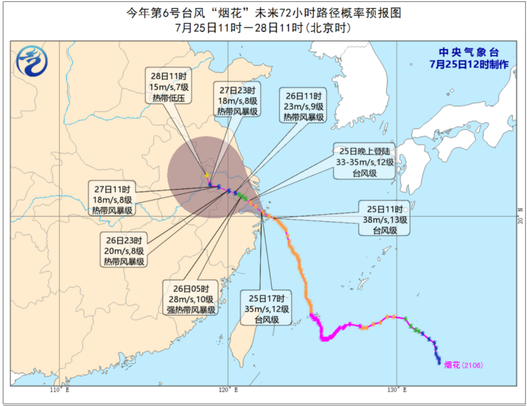 今年第6号台风“烟花”,7月25日上午11时位于浙江省舟山市偏东方向约50公里的海面上,预计最大可能于7月25日下午到傍晚在浙江舟山到上海一带沿海登陆,今明天对我市有严重影响。