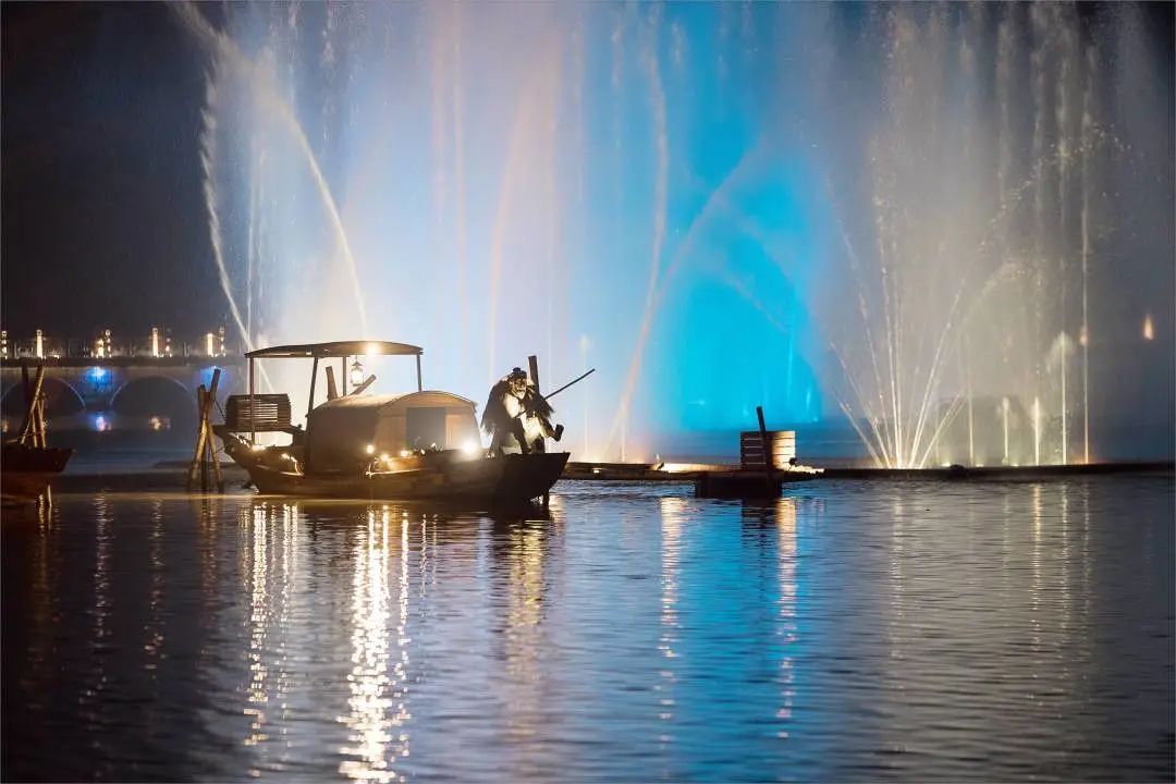 夜·渔回归:深蓝幕空下,优美如臻画境般的粼粼波光辉映长桥剪影,一场沉浸式的“蚬江渔唱”正如荼上演,一舟蓑笠,灯火如莹且将脚步停驻细赏。
