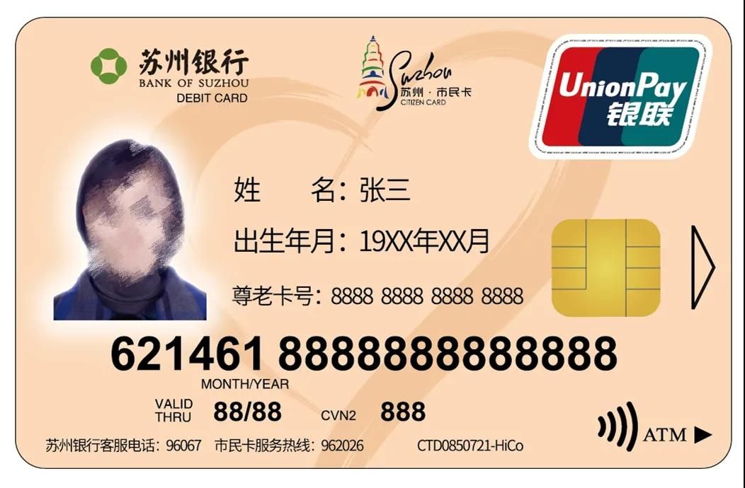 答:苏州市尊老卡采用统一的卡面样式,正面印有“江苏省老年人优待证”“苏州市尊老卡”“苏州市民政局监制”等字样,背面印有老年人姓名、照片、出生年月、尊老卡卡号、银行卡号、市民卡和相应银行标识、银联标识、客服电话等信息。