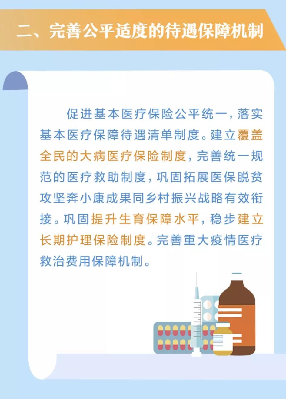 公平普惠的待遇保障机制逐步健全,职工和城乡居民医保政策范围内住院费用报销比例分别稳定在85%和70%左右。低收入人口参加基本医疗保险实现动态全覆盖,待遇倾斜政策精准落实,困难群众“基本医疗有保障”得到进一步稳定巩固。基本医疗保险为主体、大病保险为补充、医疗救助为托底的三重制度保障体系持续健全完善并统一规范;职工补充医疗保险、商业补充医疗保险等协同发展的多层次医疗保障体系初步建立,生育保险与职工基本医疗保险合并实施,医疗保障网进一步织密扎牢。低收入人口参加基本医疗保险实现动态全覆盖,待遇倾斜政策精准落实,困难群众“基本医疗有保障”得到进一步稳定巩固。