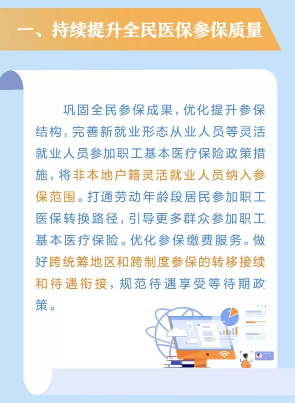 据了解,“十四五”期间,江苏将根据就业人口、城镇化率等指标,科学合理确定年度参保扩面目标,逐步实现职工基本医疗保险以劳动就业人口为参保扩面对象。鼓励个体工商户和农民工参加职工基本医疗保险,打通参加居民基本医疗保险的劳动年龄段居民向职工基本医疗保险的转换路径,引导更多群众参加职工基本医疗保险。全面落实居住证参保政策,更好实现居民在常住地参保。