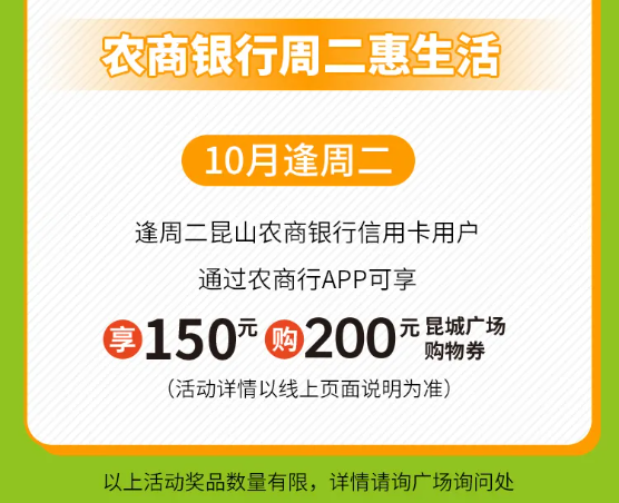 每周二昆山农商银行信用卡用户通过手机银行抢券150元抵200元代金券。