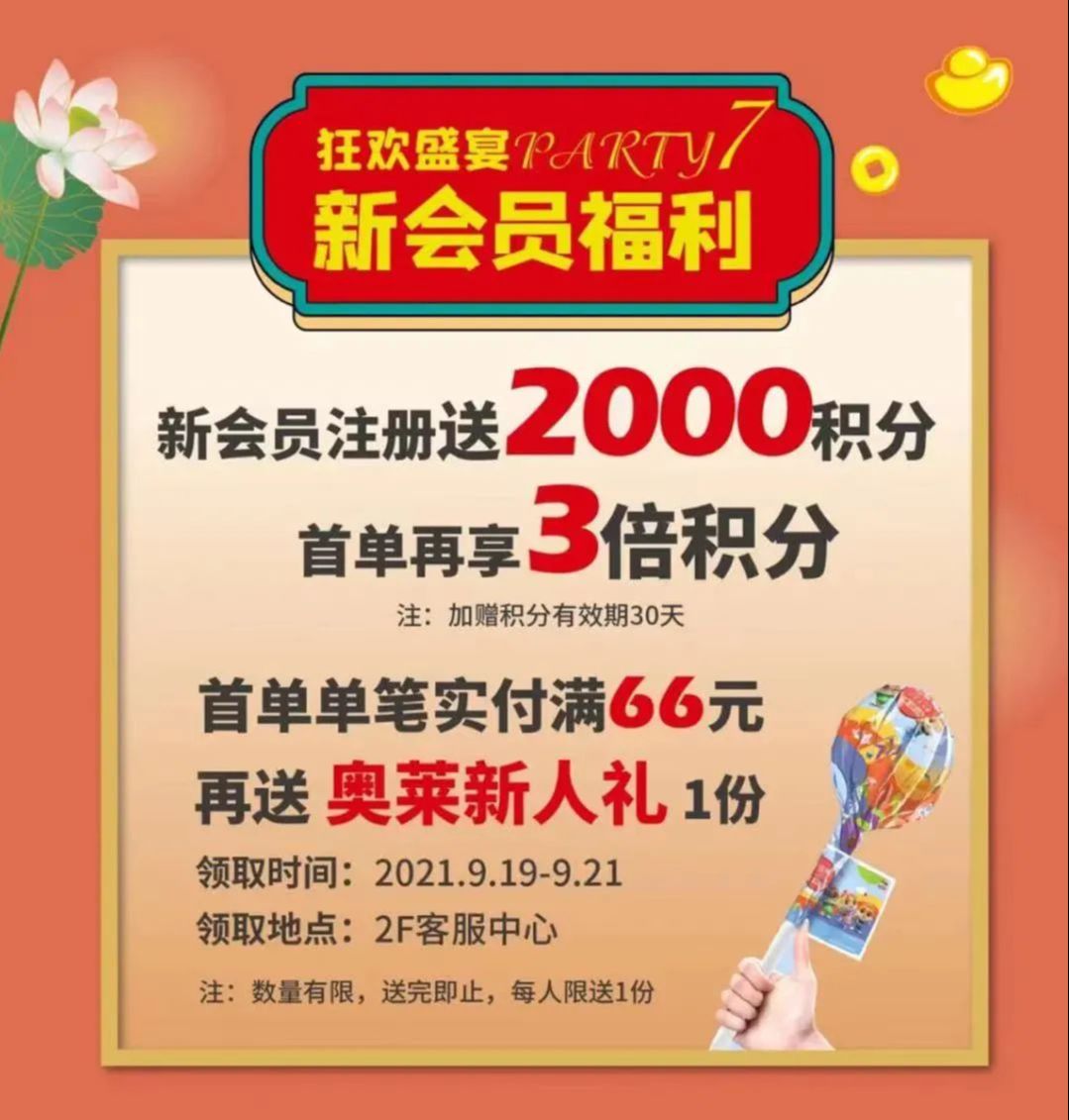 新会员注册送2000积分,首单消费满66即可领取礼品1份并且享受3倍积分。
