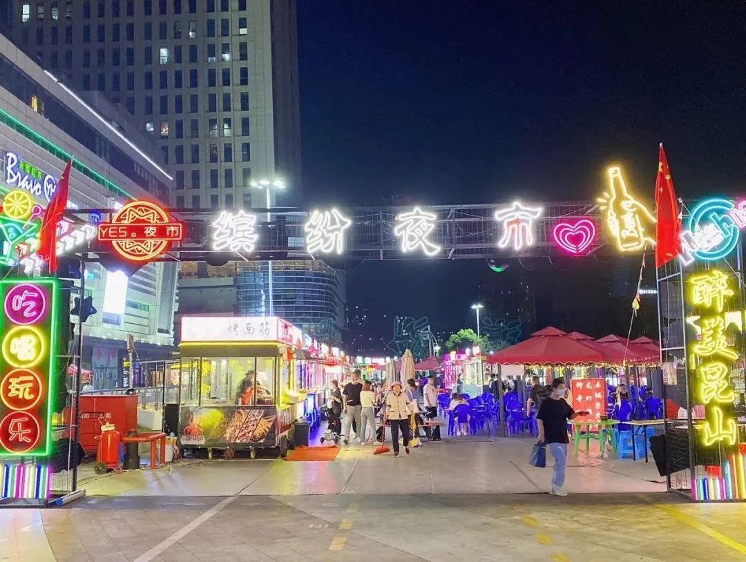 万达Yes夜市位于昆山经开万达广场外广场。其中万达一楼外广场夜市占地约2000平方米,共有夜市景观车或景观摊位30余家,包括小百货、饰品、小果、小吃、服饰等。
