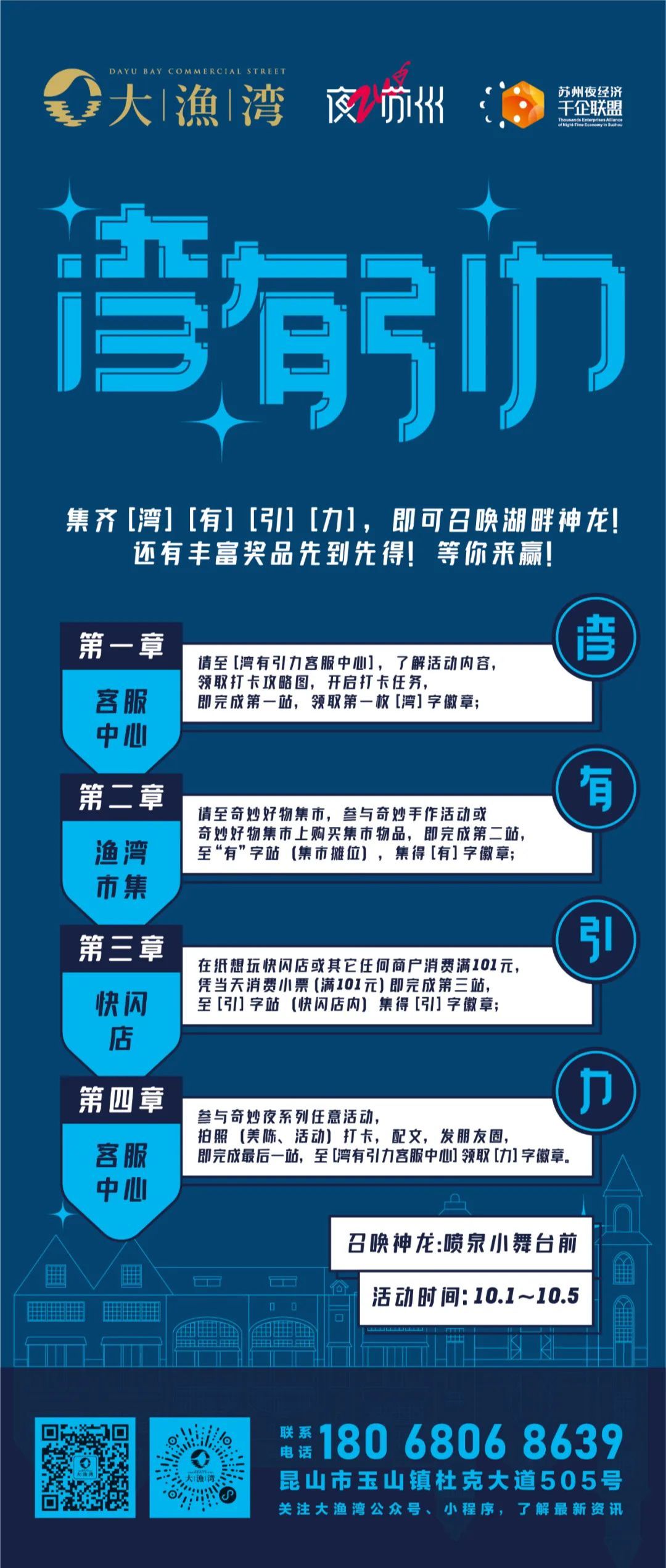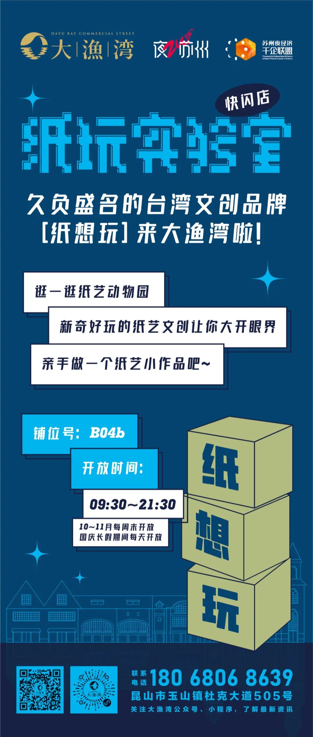 除了商户周年庆促销活动,周年庆以大渔湖为舞台背景,安排了连续3天的奇妙夜演出,如国潮服装秀、沉浸式魔术表演、摩登复古服装秀、华尔兹舞蹈等。渔湾市集如约而来,在以往基础上,本次市集扩充体量,现场邀约了60个苏州文创、手作品牌,并且邀请5位匠人担任手作体验课授课老师,每天开设一场手作之旅。国庆期间,大渔湾引入“纸箱王”快闪店,以“纸玩实验室”为创意,丰富街区业态,增加活动童趣原色。