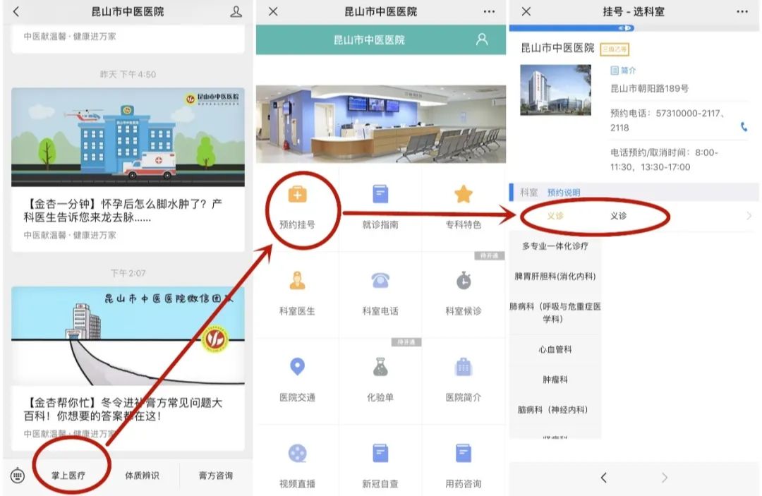 关注“昆山市中医医院微信公众号”,点击“掌上医疗”中的“预约挂号”,选择左侧菜单中的“义诊”即可。