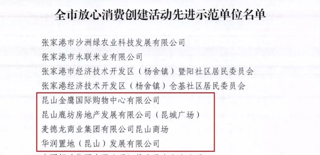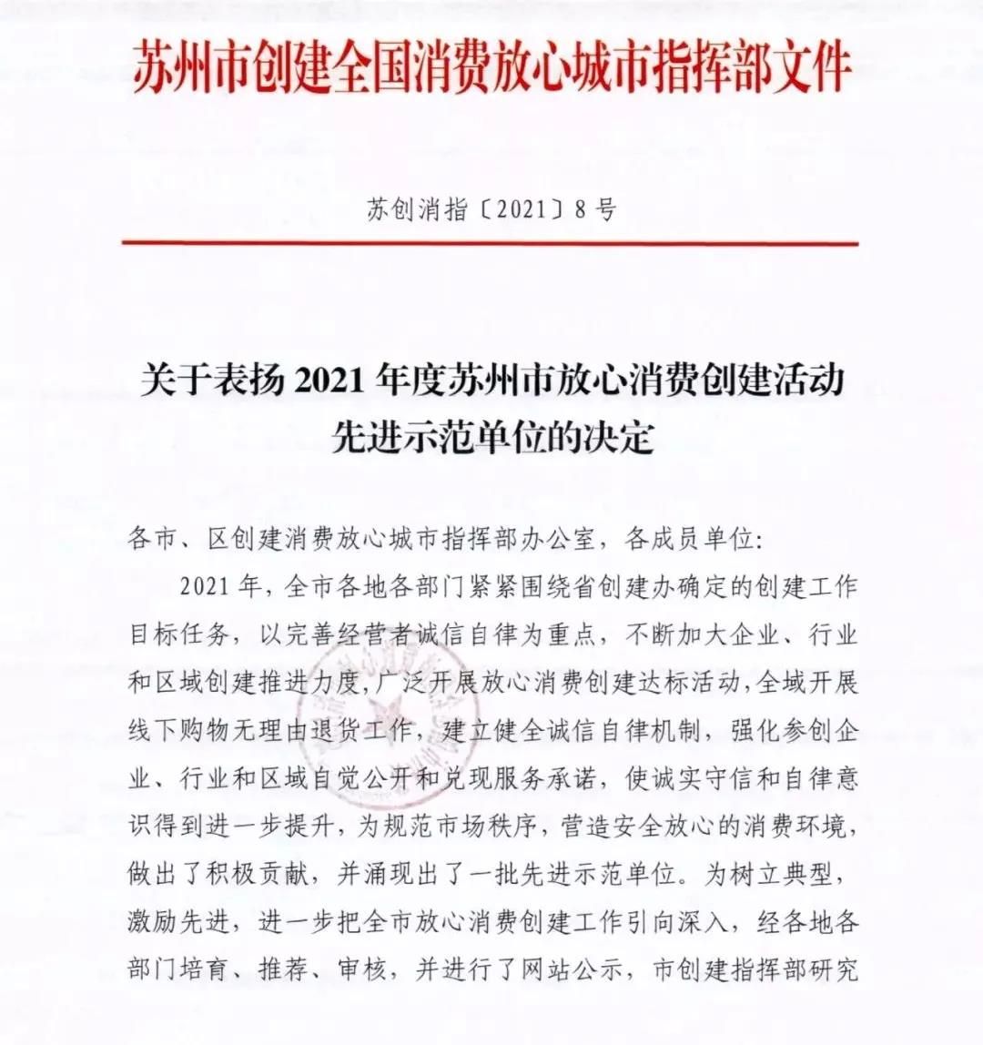 为树立典型,激励先进,根据《苏州市级放心消费创建先进示范单位认定标准》,经昆山市商务局指导推荐,我市4家大型商场、2家商业街区获评“2021年度苏州市放心消费创建活动先进示范单位”。