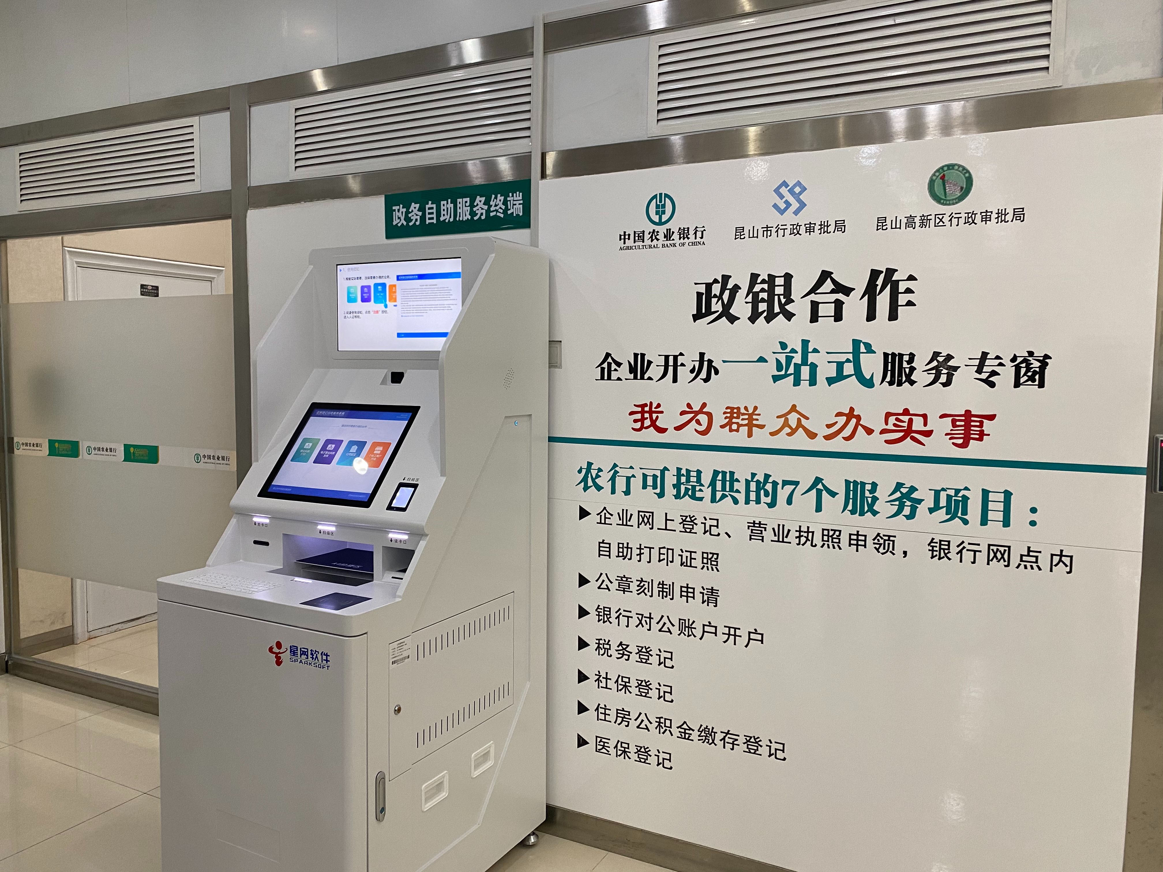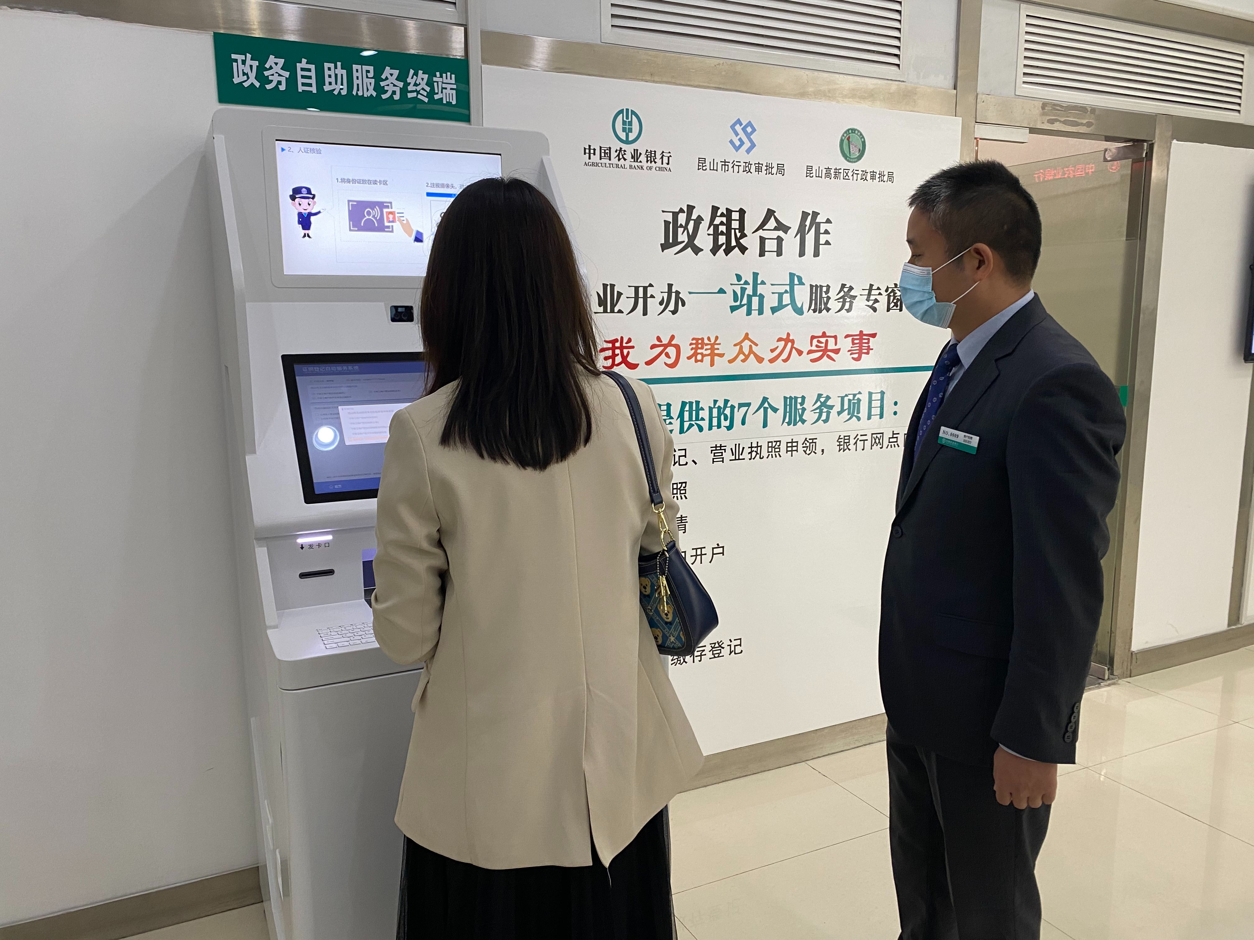 3月18日,市、区两级行政审批局在中国银行昆山分行营业部拉开了全市“政银合作”的序幕,部署了营业执照自助机和企业开办“一窗通”窗口,颁发了第一张在银行网点自助办理的营业执照。经过8个多月的实践和探索,“政银合作”模式获得了市场的认可。昆山高新区行政审批局积极推动与中农工建四大行的合作,截至目前,银行自助网点申领营业执照达700张,一站式办理刻章,公积金、社保和对公开户约110家,累计减免刻章费用5.5万元。