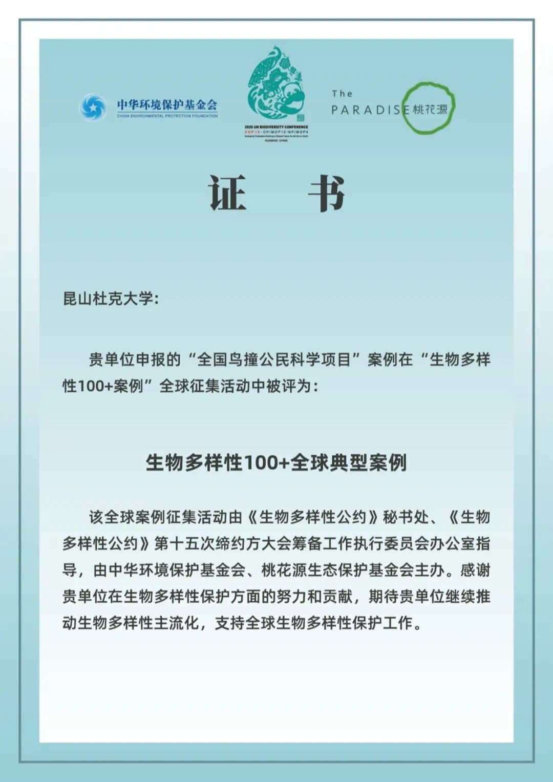 昆山杜克大学申报项目入选生物多样性100+全球典型案例