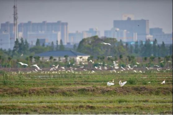 从原本以农耕为主的普通乡村到如今的湿地生态美丽图景,天福完成了华丽蝶变。据悉,早在15年前,随着省级开发区的设立,花桥开始新一轮的大发展大建设,秉持“绿色发展、生态优先”理念,这一方净土作为“生态留白地”被保留下来。此后,天福国家级湿地公园应运而生,水源与水岸保护、生物多样性及动植物栖息地保护等一系列生态修复工程逐一展开:一方面,通过设计大小、深浅不一的水塘,搭配水位调节设施,满足不同季节不同鸟类对栖息地的需求;另一方面,坚持有机种植理念,农田全年不打农药不施肥,将冬季的水稻田灌满水,让鸟类嬉戏的同时,也抑制杂草及越冬昆虫生长,为土壤增加肥力,提升稻米的质量和安全,营造“人与自然和谐共生”的实景图。