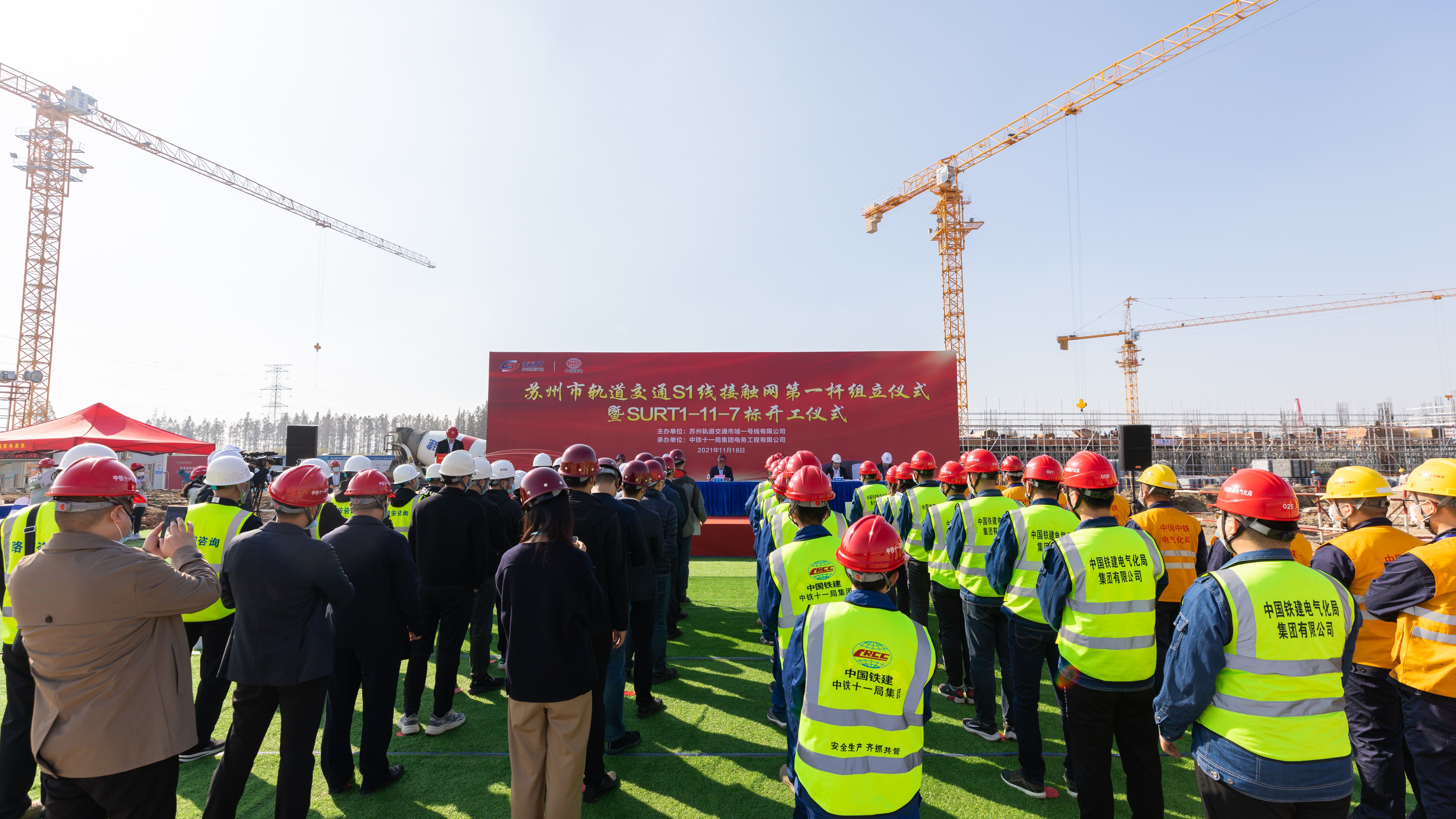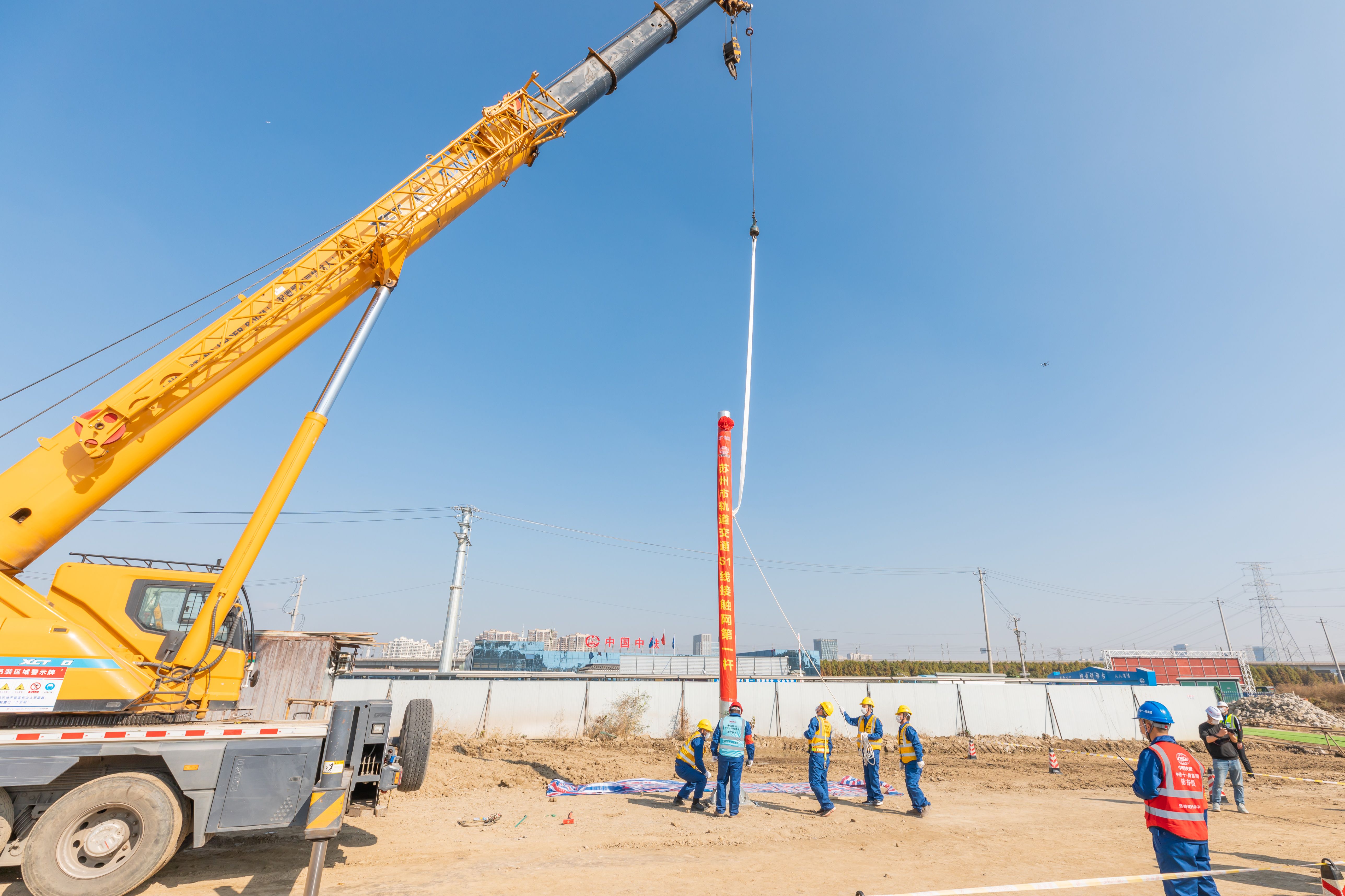 当天,由苏州轨道交通市域一号线有限公司主办、中铁十一局集团电务工程有限公司承办的苏州市轨道交通S1线接触网第一杆组立仪式暨SURT1-11-7标开工仪式在朝阳路车辆段举行。10时许,伴随着一声令下,在施工人员地指挥下,接触网立柱被吊机慢慢吊起,对准基座,然后缓缓放下,最后完成扣铆。接触网第一杆立杆以后,轨交S1线供电系统工程全面启动,全线的立杆将按既定时间节点推进,为站后工程打下了坚实的基础。