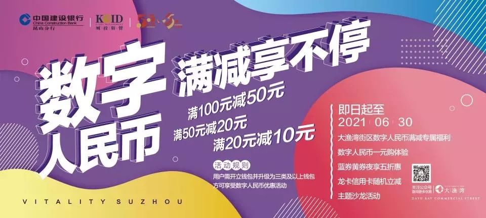 2021年第二季度,大渔湾联动中国建设银行,启动了数字人民币的消费试点应用场景,实现全街区经营户,加速了数字人民币应用“飞入寻常百姓家”,提升了市民认知度。